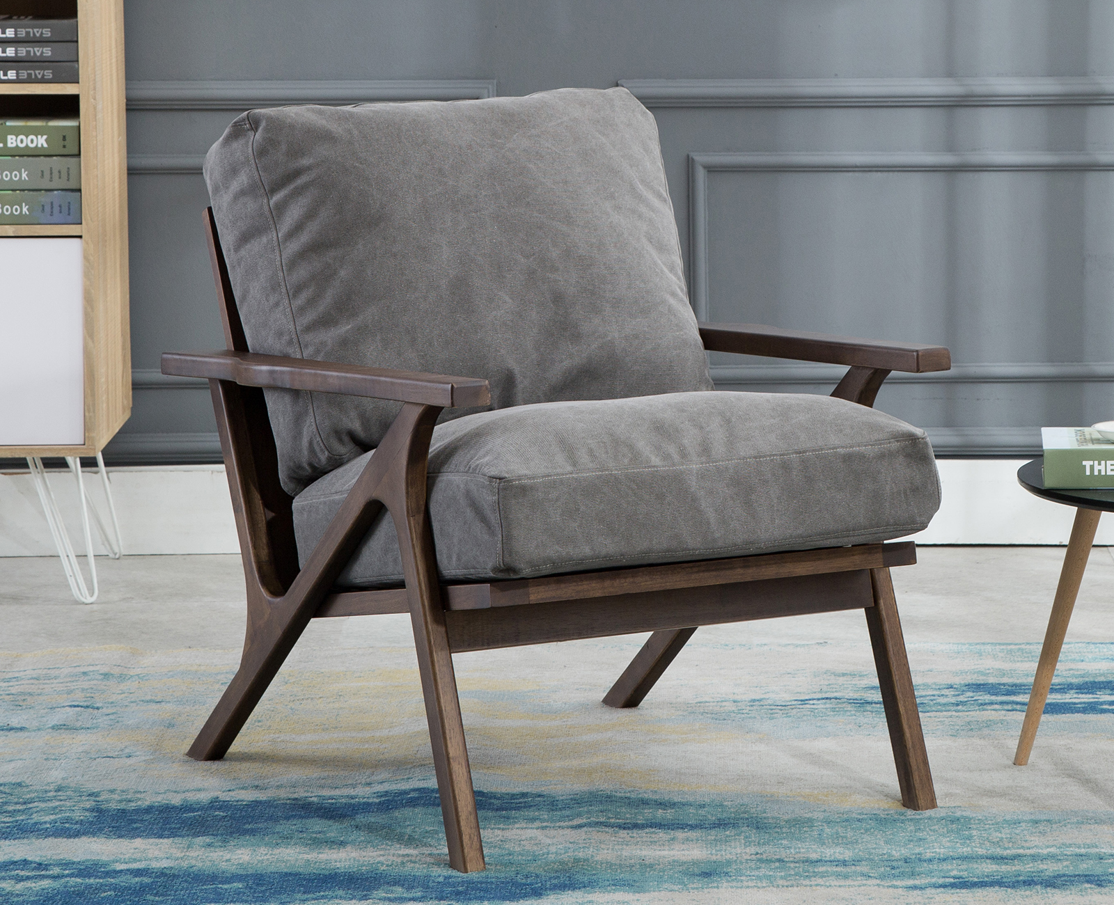 Guyou Modern Accent Chair, Mid Century Upholstered Lounge Arm Chair with Wooden Frame and Removable Denim Cushion Single Sofa Chair for Living Room Bedroom Study, Grey