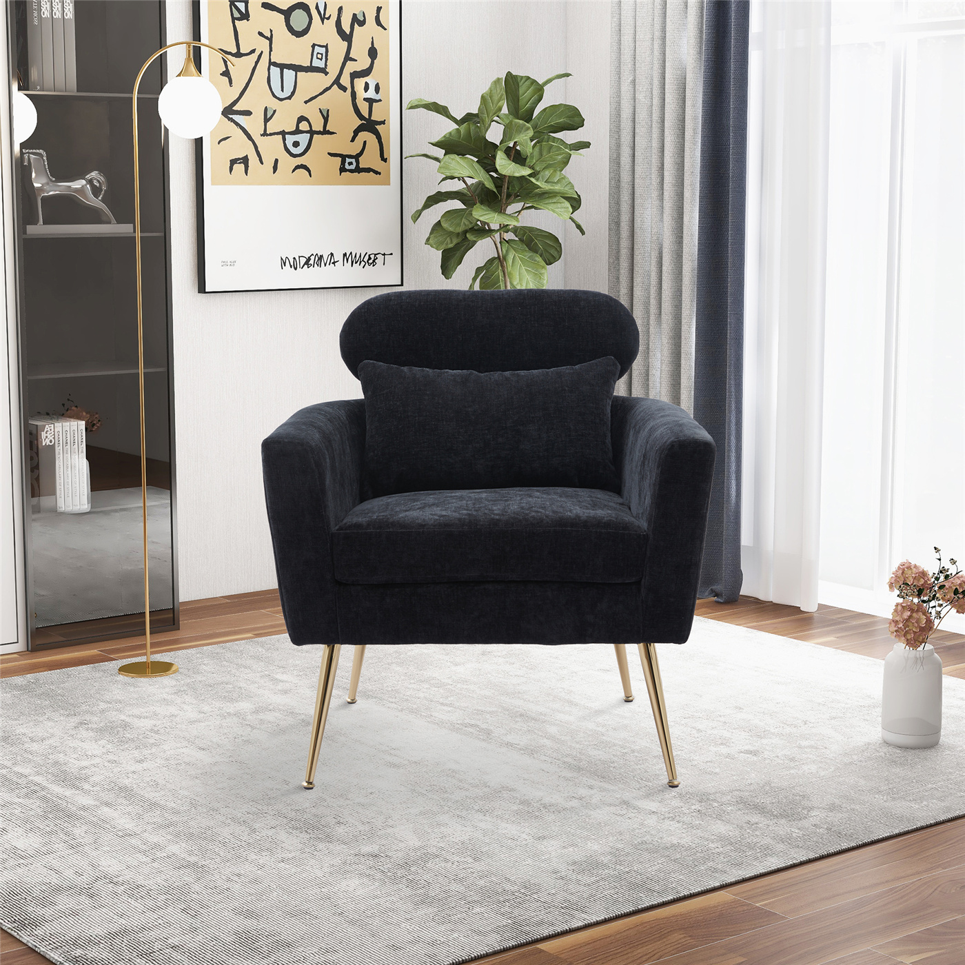 29.5"W Modern Chenille Accent Chair, Upholstered Single Sofa Armchair, Leisure Club Chair with Gold Metal Legs and Throw Pillow for Living Room Bedroom Office, Black