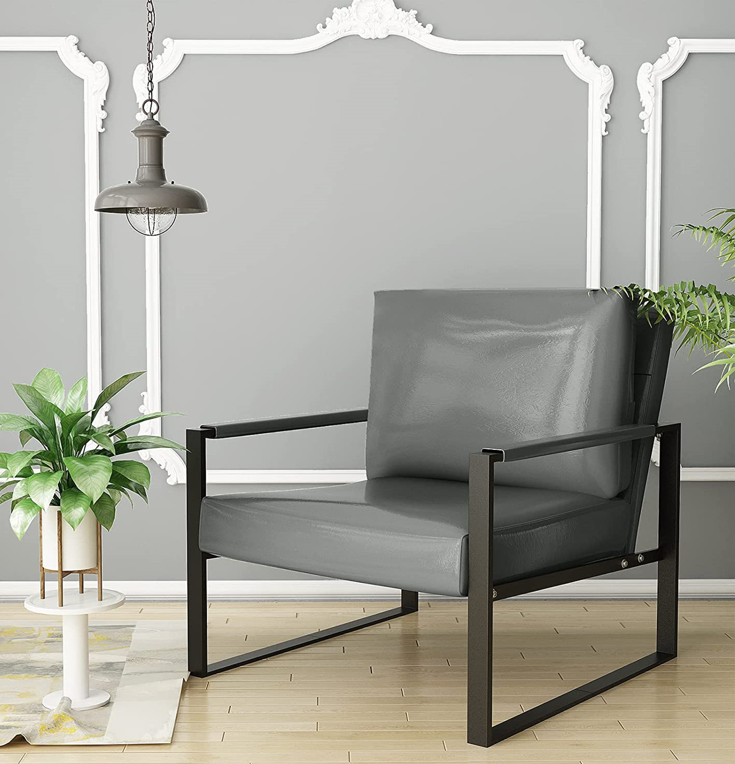 DKLGG Mid-Century Modern Accent Chair, Modern PU Leather Chairs with Armrests, 28 Inch Metal Frame Sofa Chair, Gray