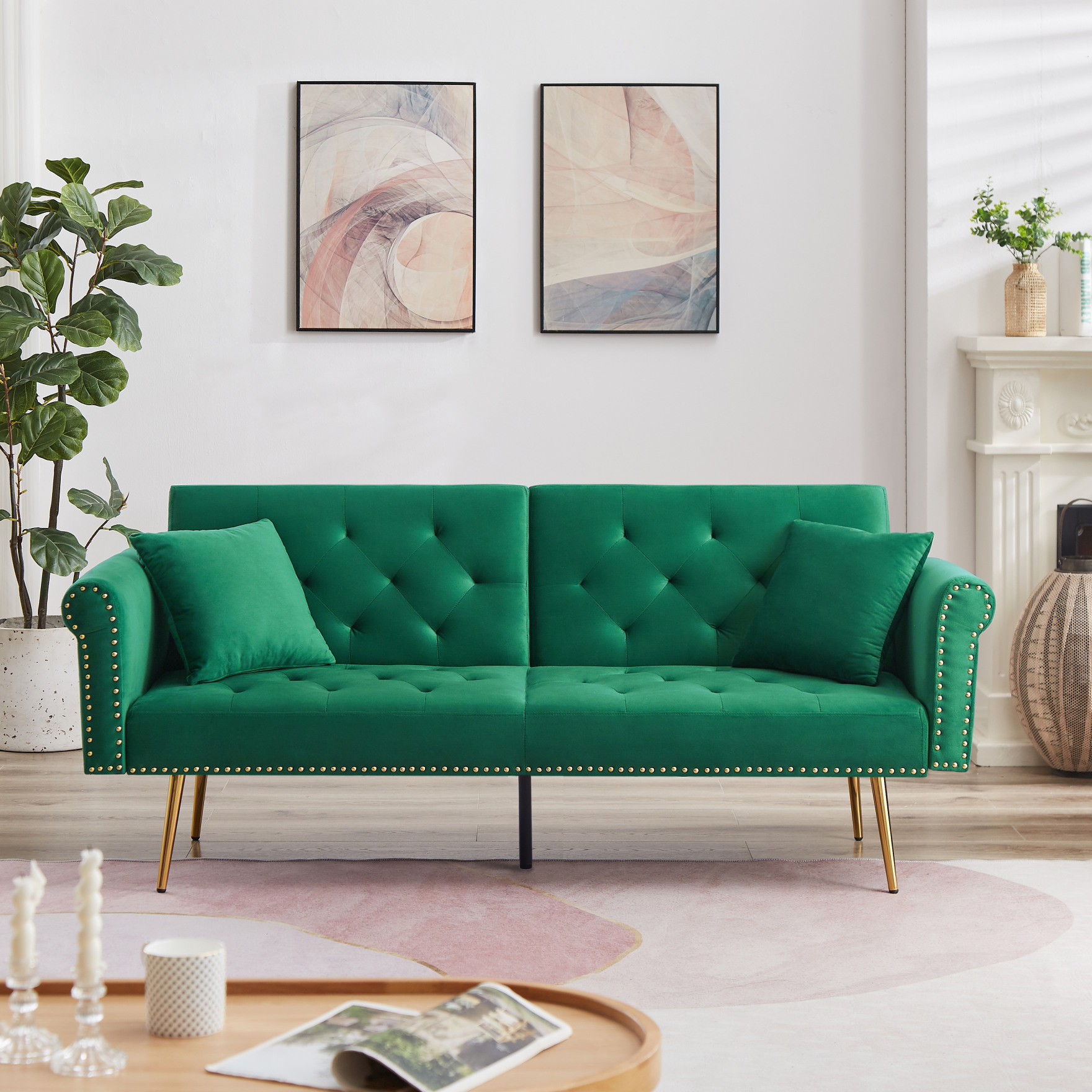 Convertible Futon Sofa Bed with Adjustable Backrest, Modern Reclining Velvet Loveseat Couch with 2 Pillows and Nailhead, Sleeper Sofa for Dorm Room Living Room, Green