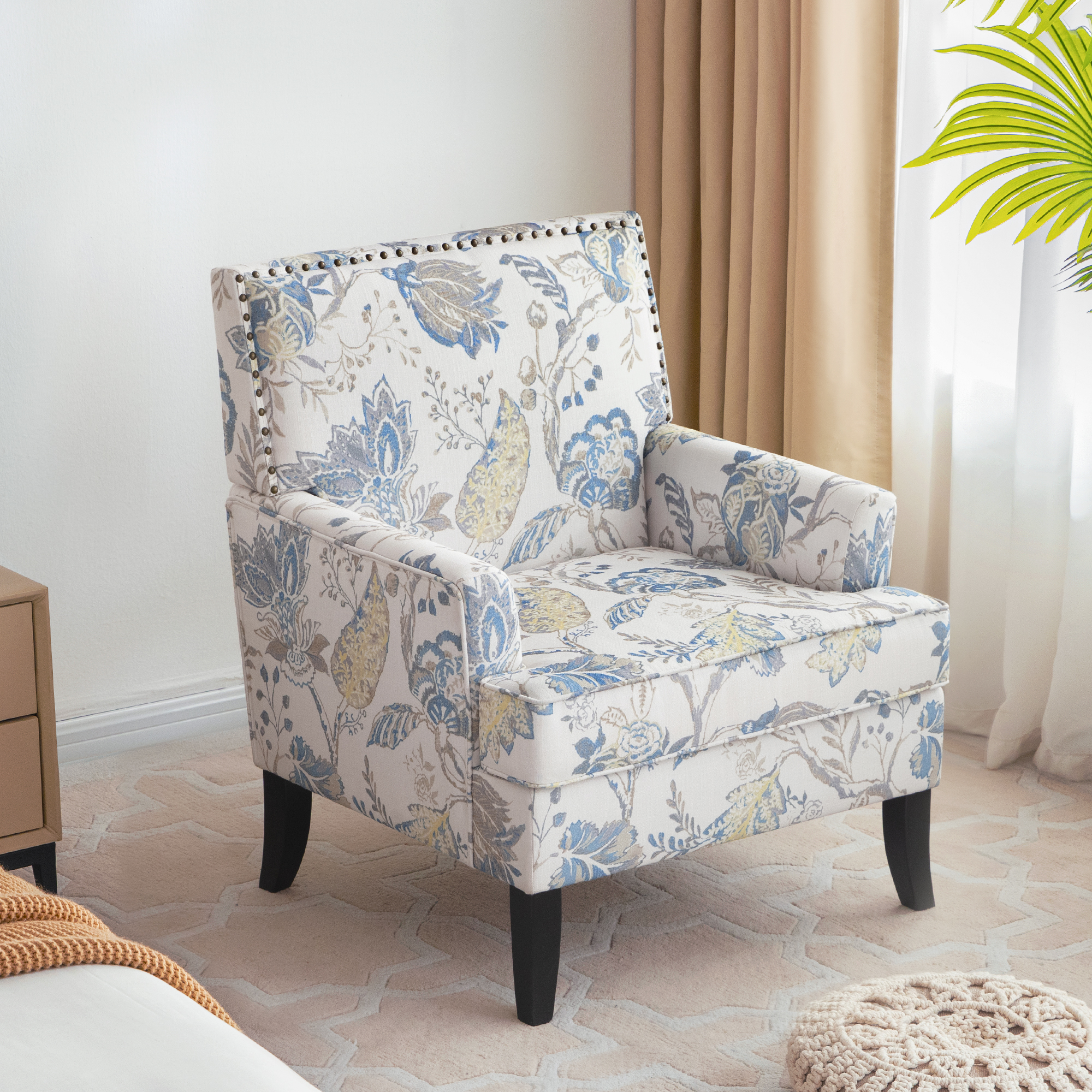 HUIMO Printed Accent Chair Upholstered Linen Fabric Living Room Chair with Rivet Armchair with Wooden Legs, Comfy Reading Sofa Chair for Bedroom, Study (Blue Floral)