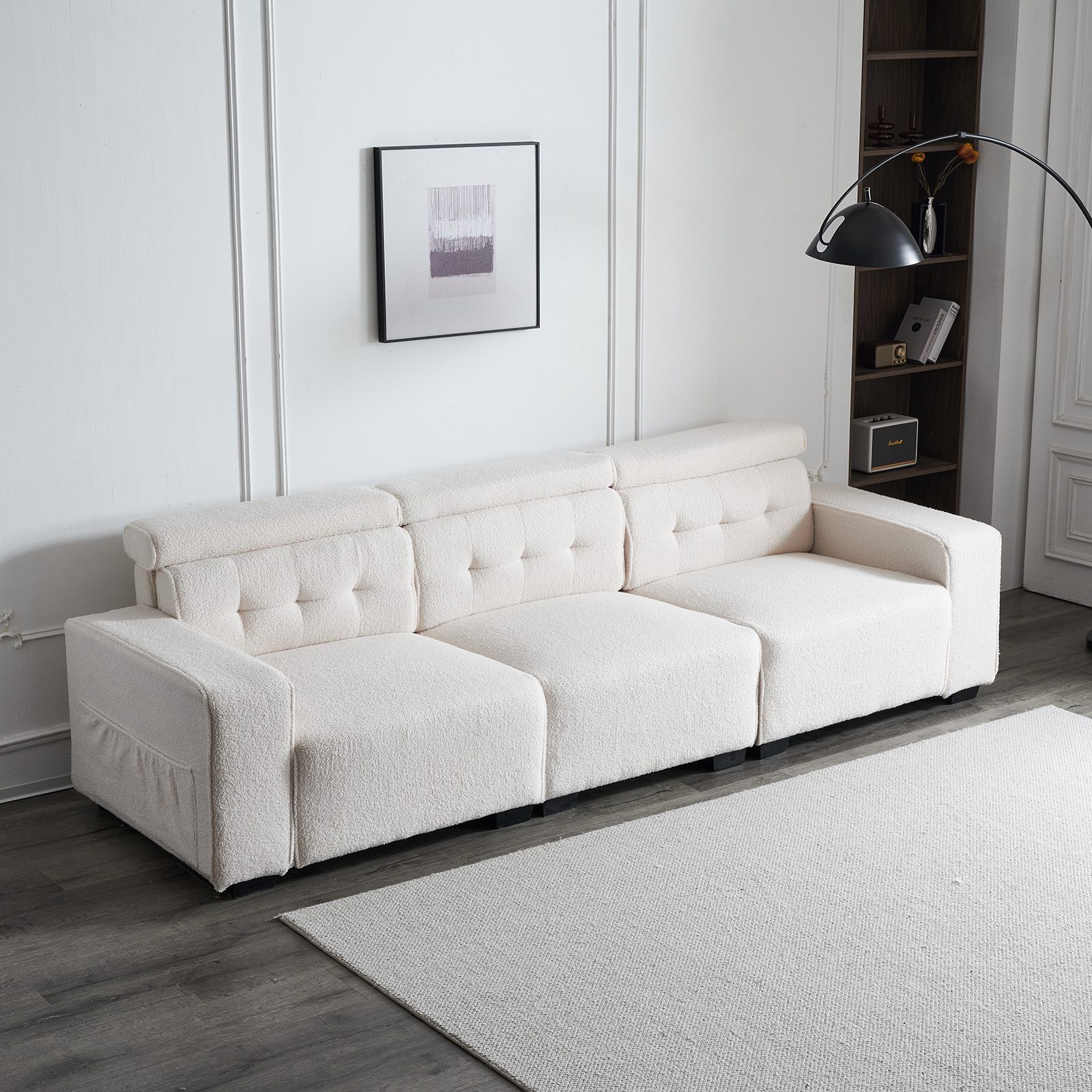 Ktaxon 115" 3-Seater sofa Modern Upholstered Couch with Adjustable Neck Pillows Teddy Velvet Deep Sofa with Wide Armrest and Seat for Apartment Living Room Creamy White