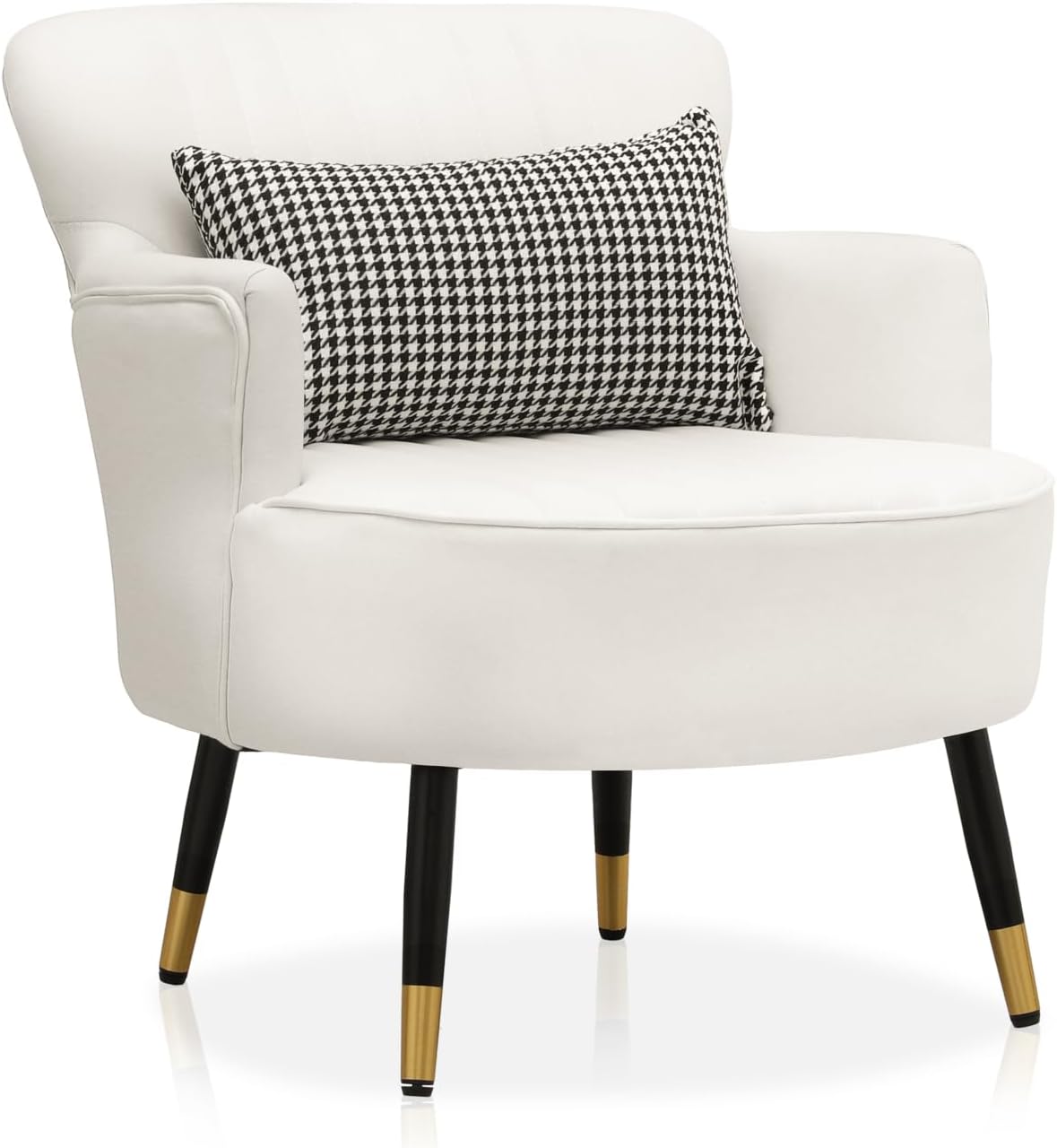Chair Modern Armchair Single Sofa Chair With Lumbar Pillow, Mid Century Modern Comfortable Leatheraire Reading Chair For Living Room Bedroom, Metal Legs Back Club Arm Chair, White