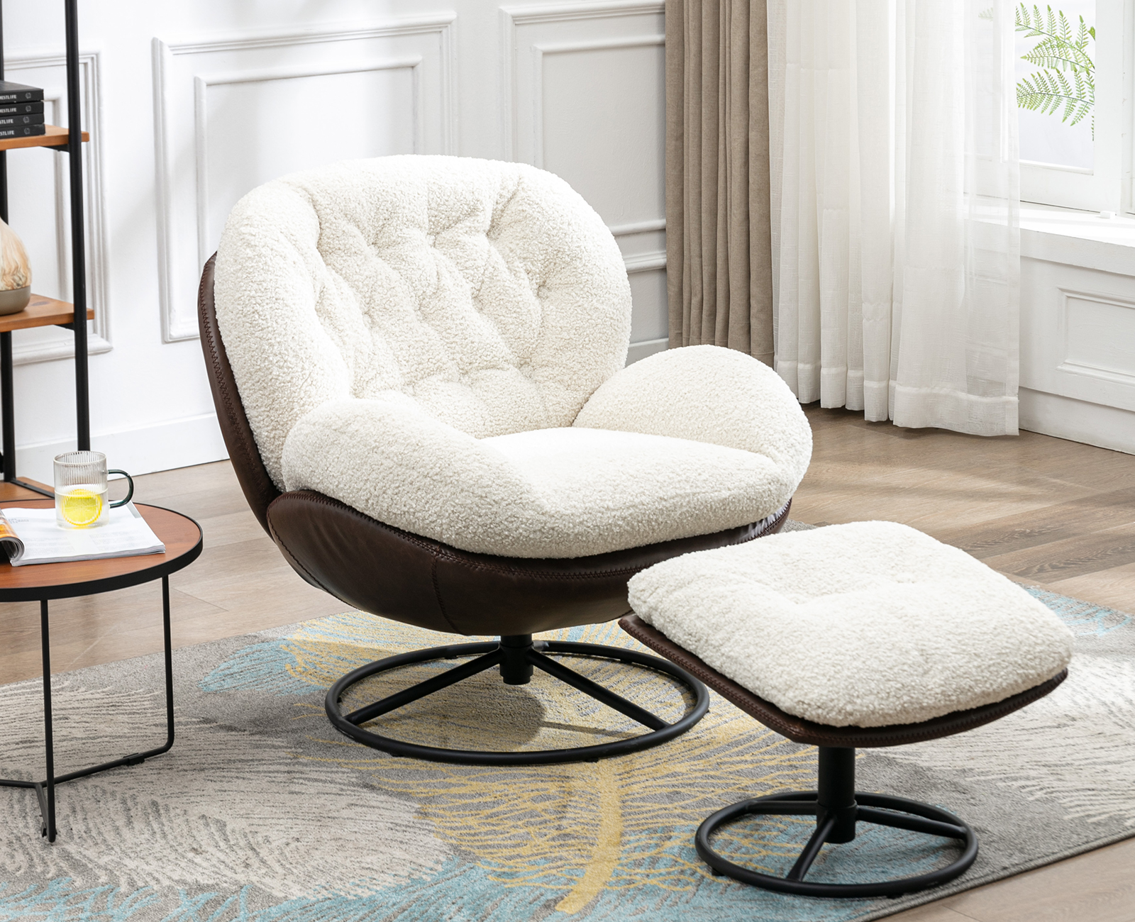 Guyou Swivel Accent Chair with Ottoman Set, Faux Fur Lounge Chair with Footrest, 360 Degree Swiveling Single Sofa Chair, Fluffy Reading Chair Armchair for Living Room Bedroom, White