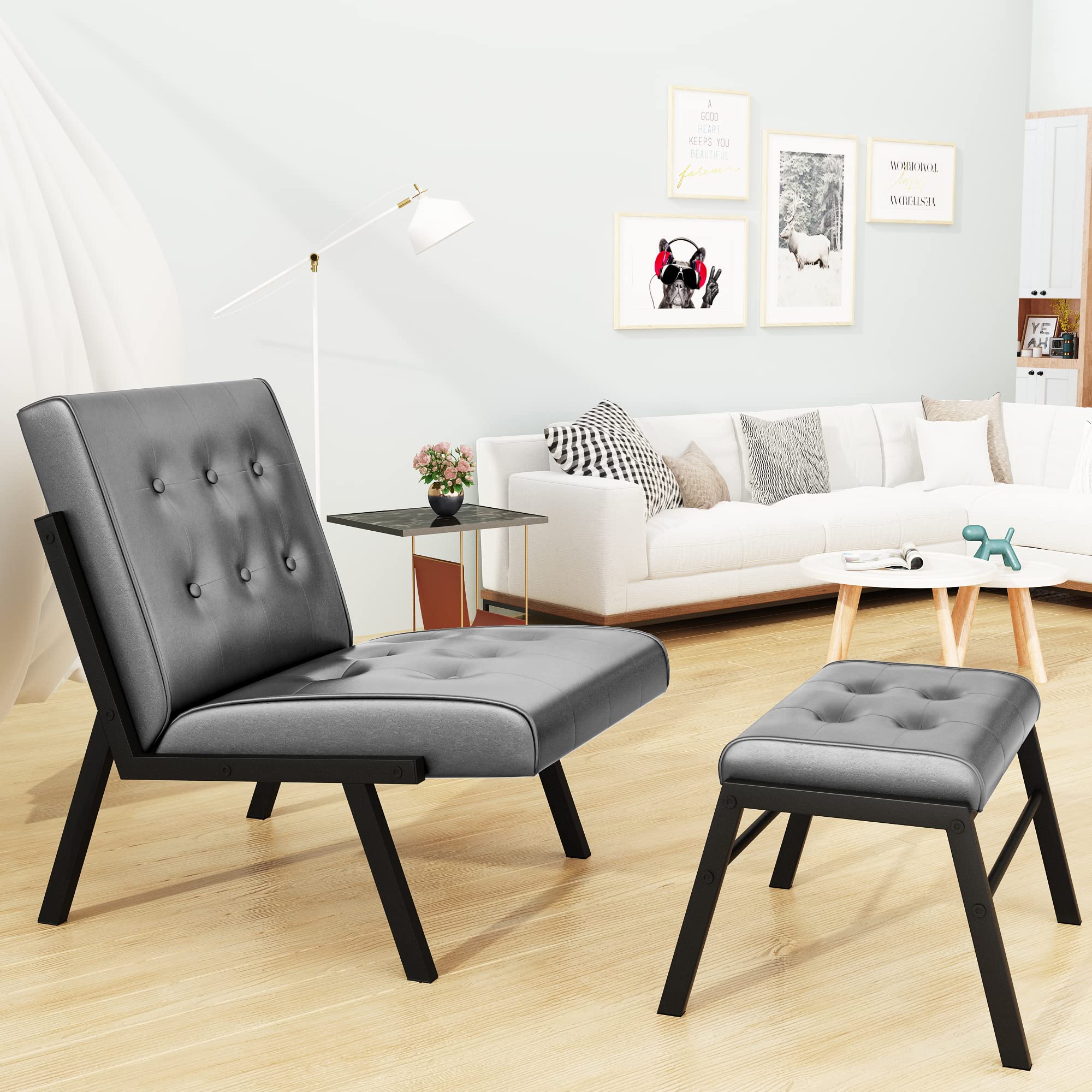 AWQM Leather Accent Chair with Ottoman,Modern Lounge Chair with Footrest,Single Sofa Chair with Metal Legs,Recliner with Footrest Comfy Living Room Chairs Reading Chair for Bedroom,Grey