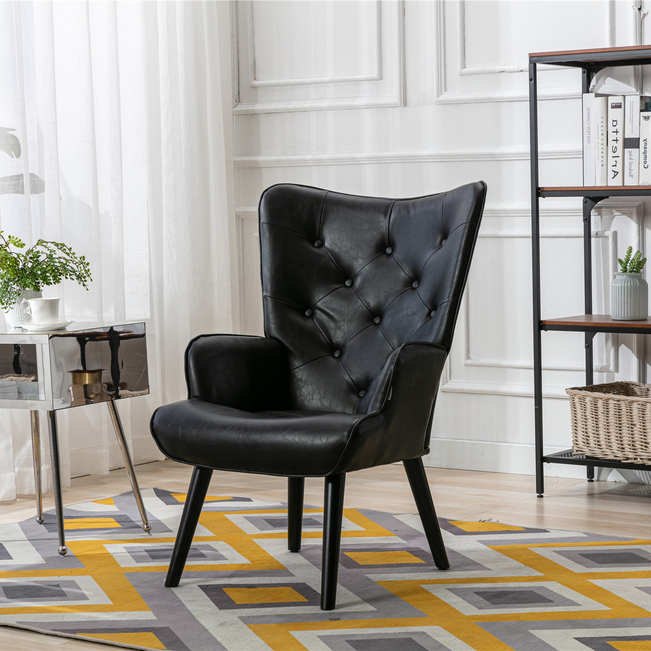 Royard Oaktree Accent Chair Upholstered Leisure Chair Modern Wingback Armchair with Wood Legs PU Leather Tufted Button Single Sofa for Living Room Bedroom Office,Black