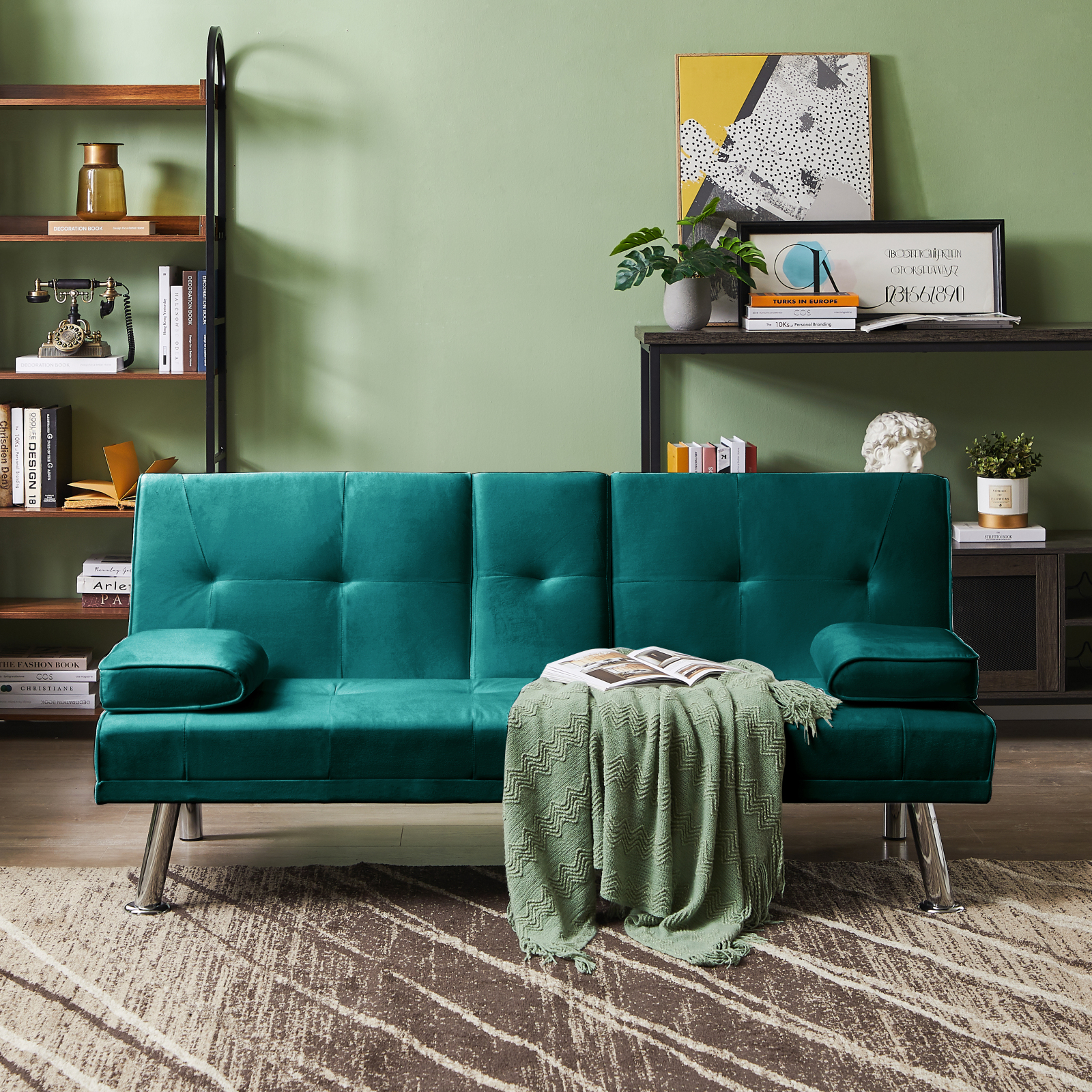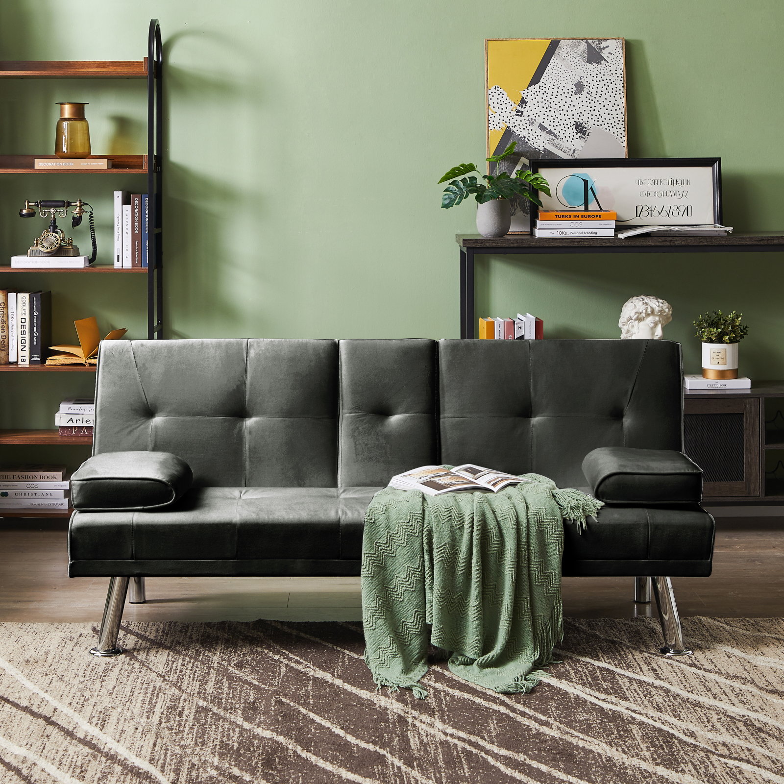 Miekor Furniture Velvet Upholstered Modern Convertible Folding Futon Sofa Bed Removable Armrests, Metal Feet with 2 Cup Holders 40133