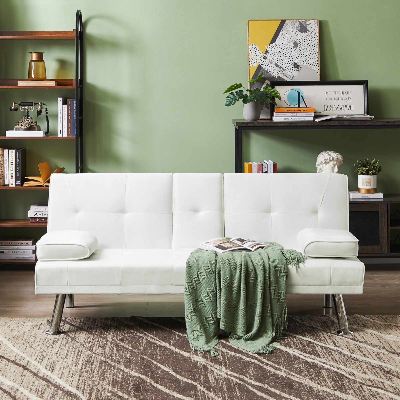 Miekor Furniture Velvet Upholstered Modern Convertible Folding Futon Sofa Bed Removable Armrests, Metal Feet with 2 Cup Holders 40138