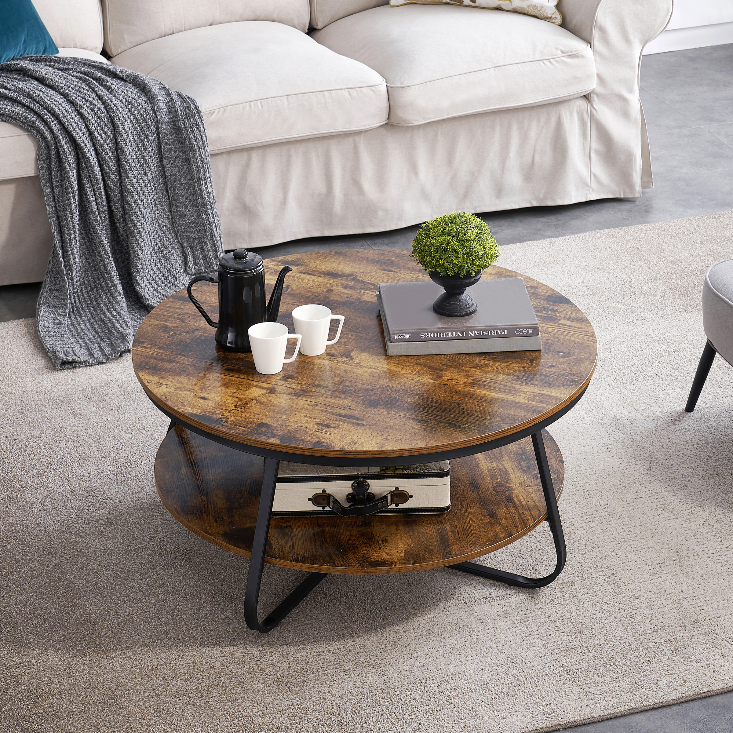 GEZEN Round Coffee Table with Open Storage, 38.5" Wood Sofa Table Rustic Accent Table with Sturdy Metal Legs for Living Room