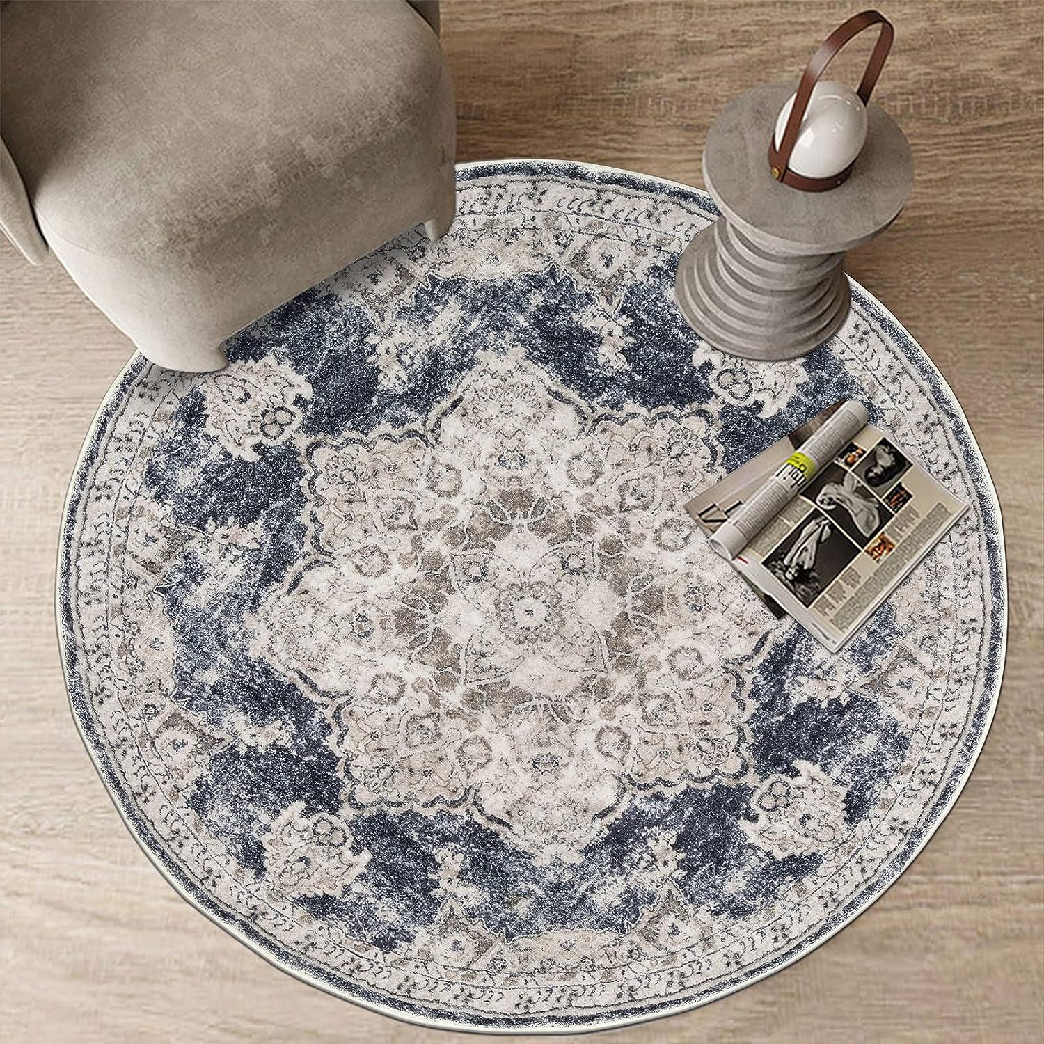 4 FT Round Area Rug, Yamaziot Boho Vintage Oriental Circle Carpet, Washable Non Slip Non Shedding Soft Fall Indoor Floor Mat Rug for Bedroom Living Room Sofa Office Bathroom Kitchen