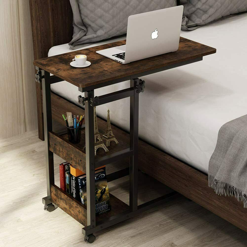Snack Side Table, Mobile End Table Height Adjustable, C Shaped TV Tray with Storage Shelves for Sofa Couch - Retro Brown