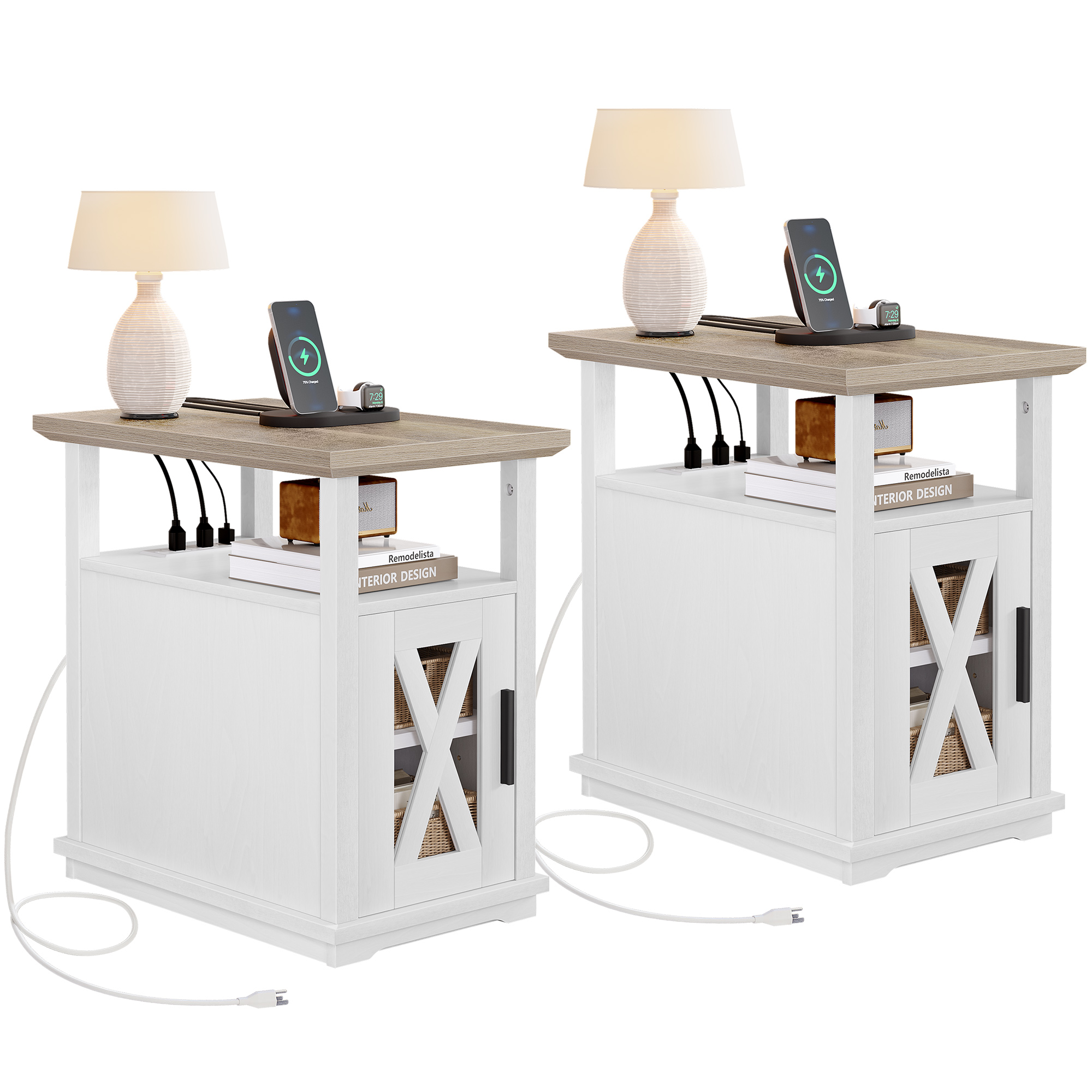 Dextrus Farmhouse End Table Set of 2 with Charging Station, Sofa Side Table Nightstand with Storage Cabinet, White