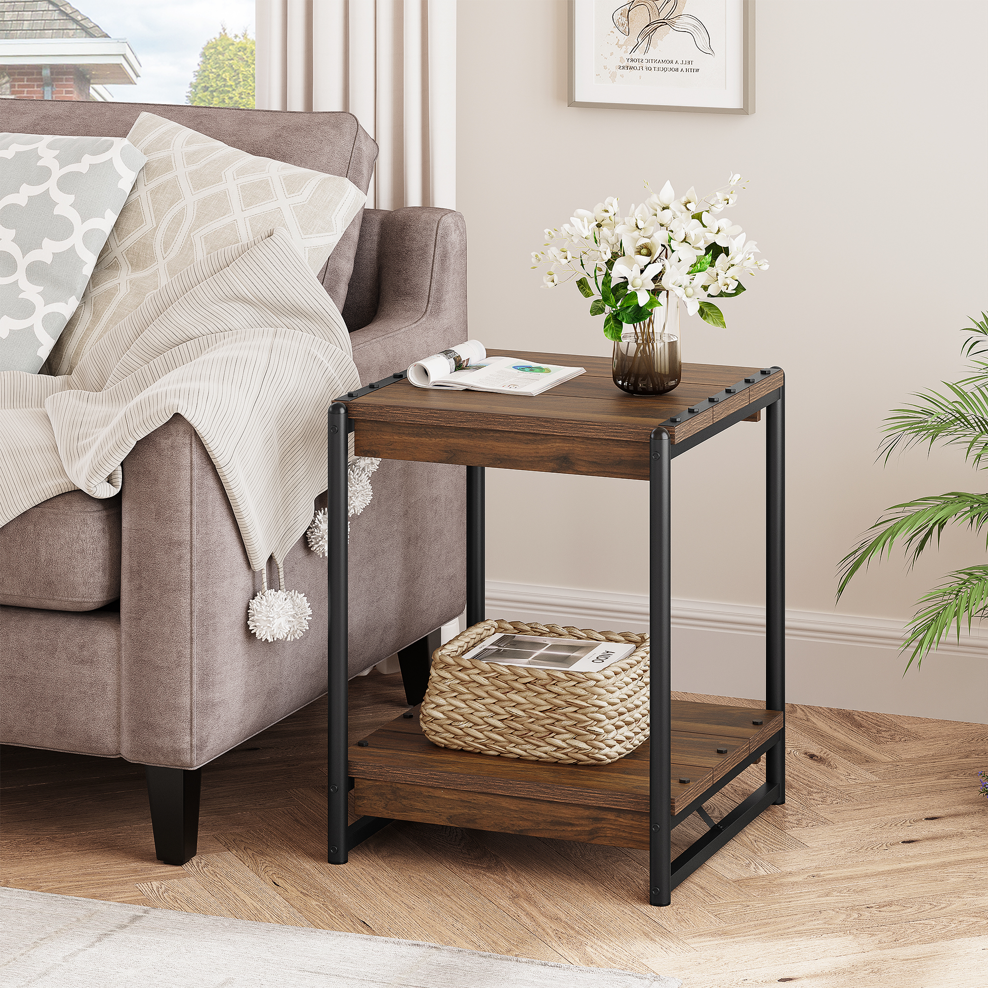 Farmhouse End Table, 19.6 Inch Sofa Side Table with 2-Tier Storage, Square End Table with Sturdy Frame, Wood Nightstand Bed Side Table for Living Room, Bedroom, Easy Assembly, Walnut Brown