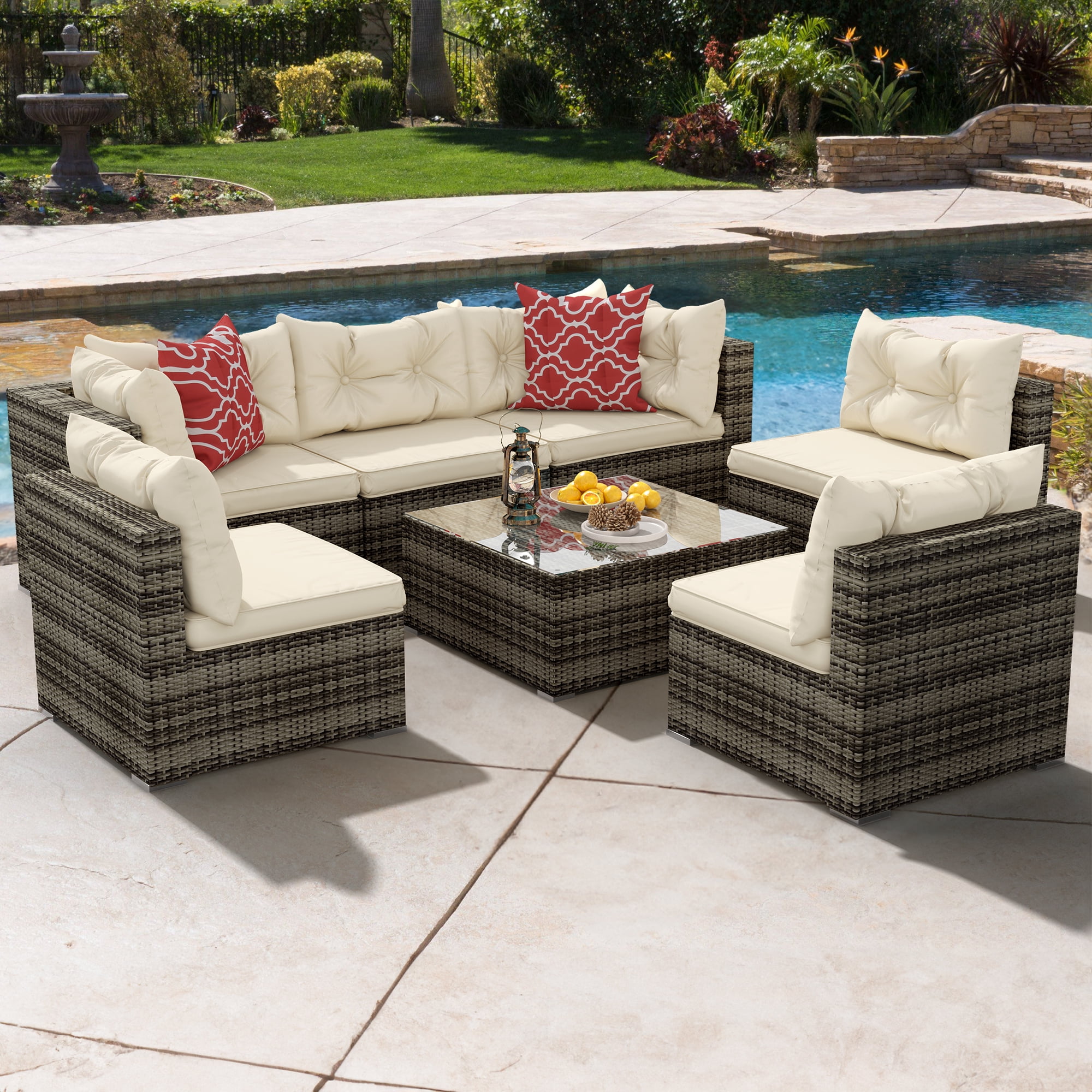 Dextrus Patio Sofa Set, 7 Pieces Patio Furniture Set Outdoor Sectional Furniture Set, All-Weather PE Rattan Wicker Patio Conversation Set for Garden, Balcony, Backyard