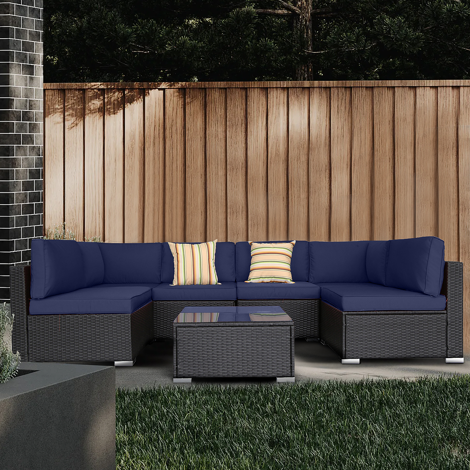 Excited Work Blue 7 PCs Outdoor Patio Rattan Sofa, Sectional Furniture Sets Manual Weaving Wicker Conversation Set with Pillow, Cushions and Glass Table