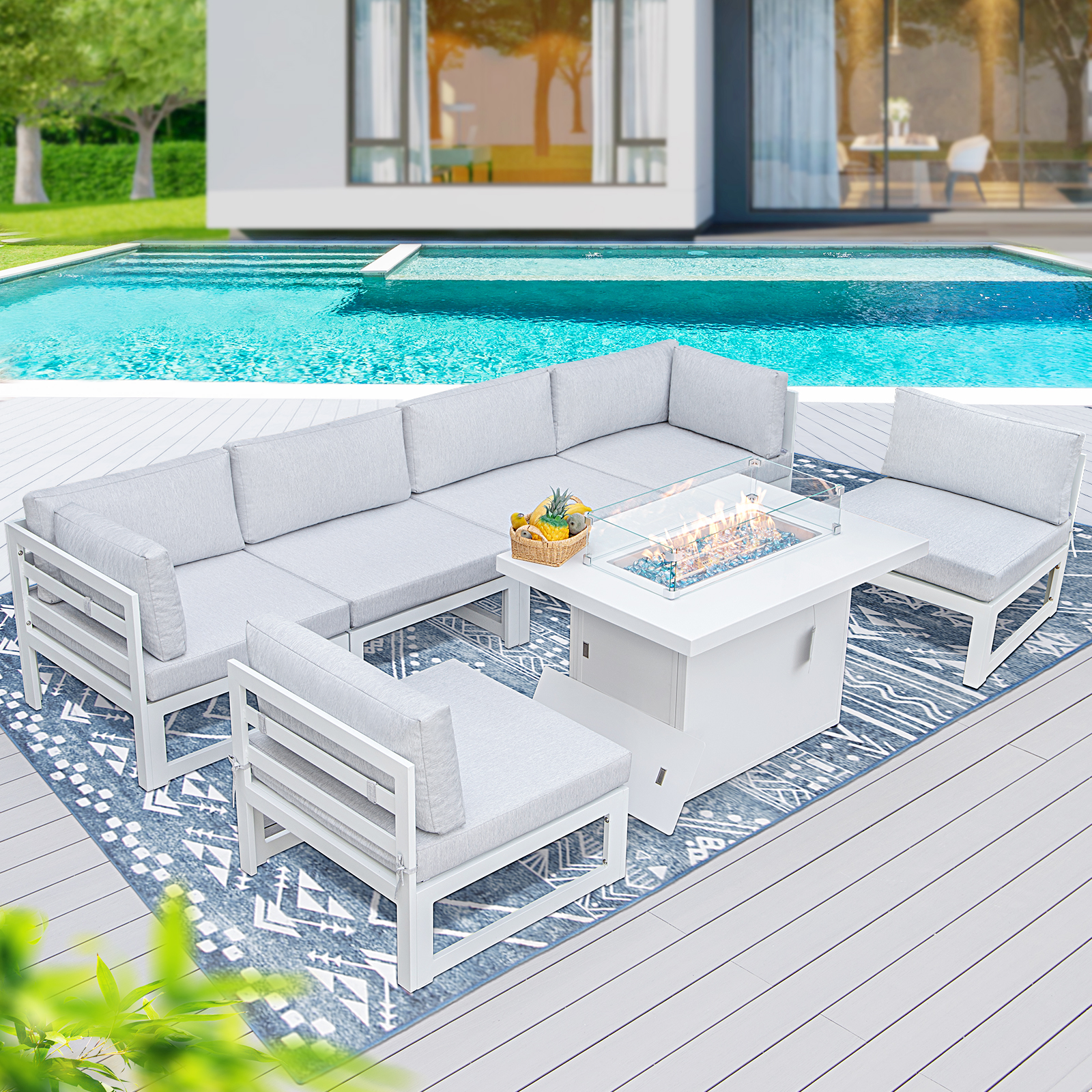 NICESOUL Aluminum Outdoor Furniture with Fire Pit Patio Sofa Conversation Set White 6 Seating