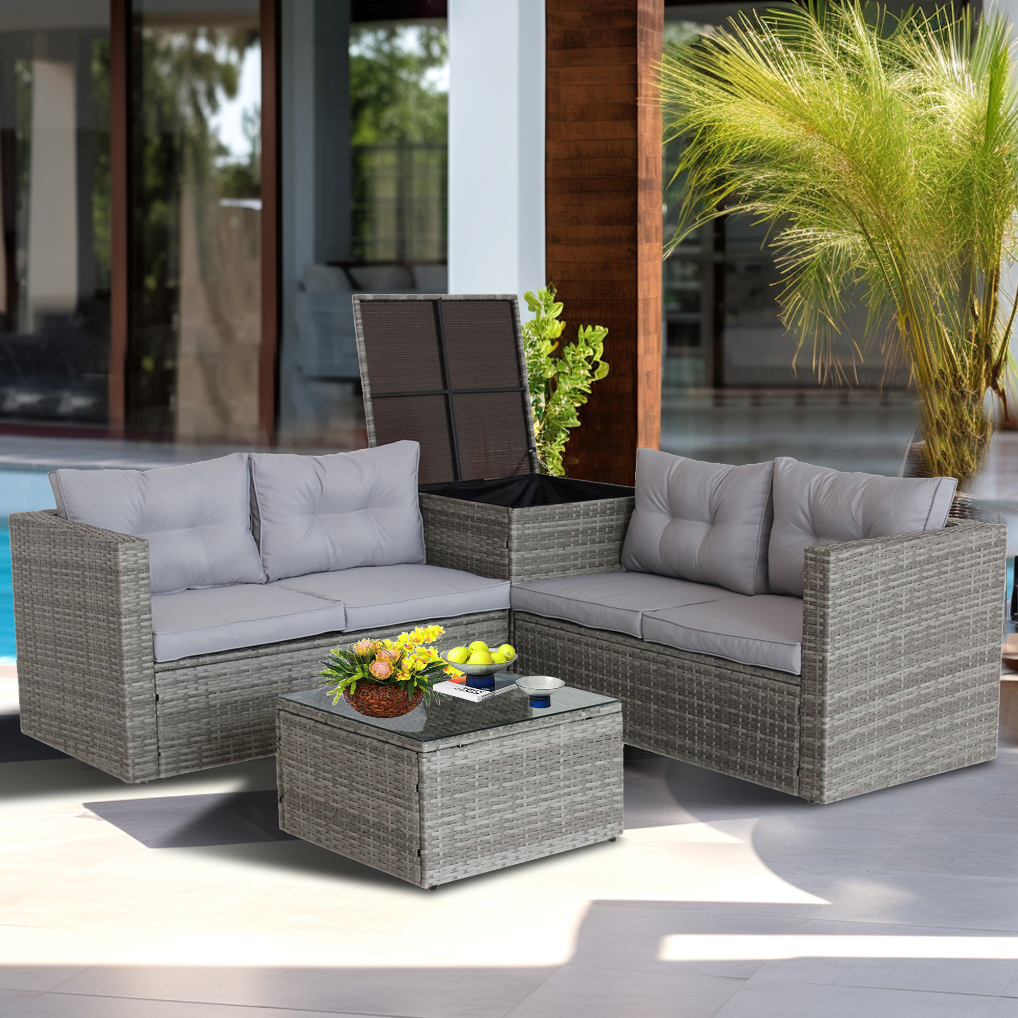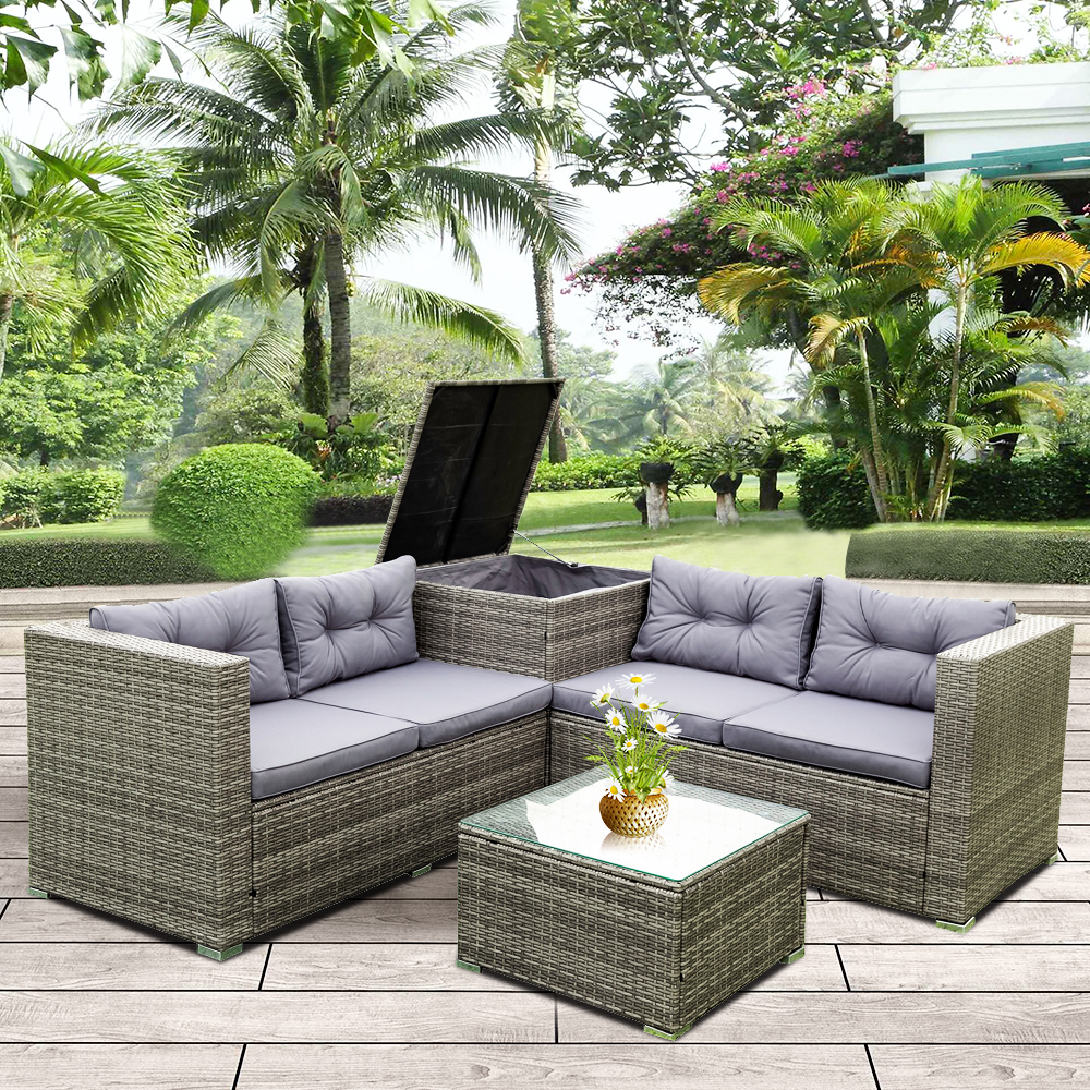 SEGMART 4 Piece Patio Furniture Set, Outdoor PE Rattan Conversation Set with Storage Ottoman, All-Weather Patio Sofa Wicker Set for Yard, Porch, Garden, Poolside, Gray
