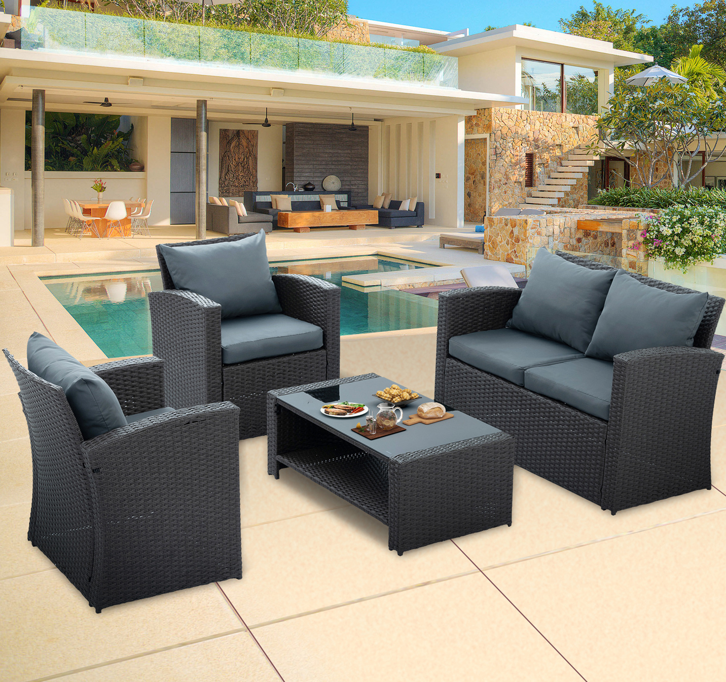 4 Pieces Patio Furniture Set, All Weather Outdoor Brown Rattan Sectional Conversation Sofa Chair with Coffee Table, Grey Cushions