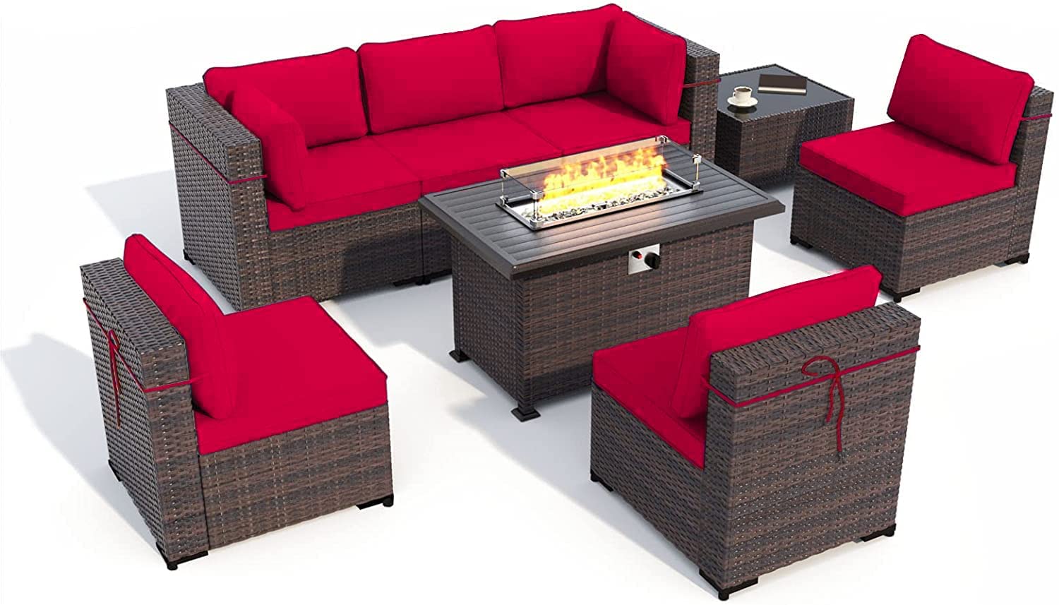 Gotland Outdoor Patio Furniture Set 8 Pieces Rattan Wicker Sectional Sofa with 43.3" Gas Fire Pit Table,Red