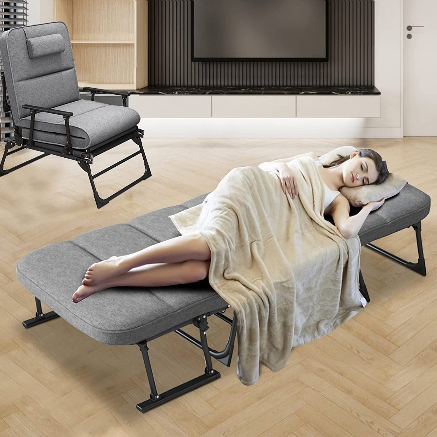 Slsy 3 in 1 Folding Sofa Bed, Portable Folding Bed with Mattress & Pillow, 6 Position Adjustable Convertible Chair, Rollaway Guest Bed Fold Out Bed