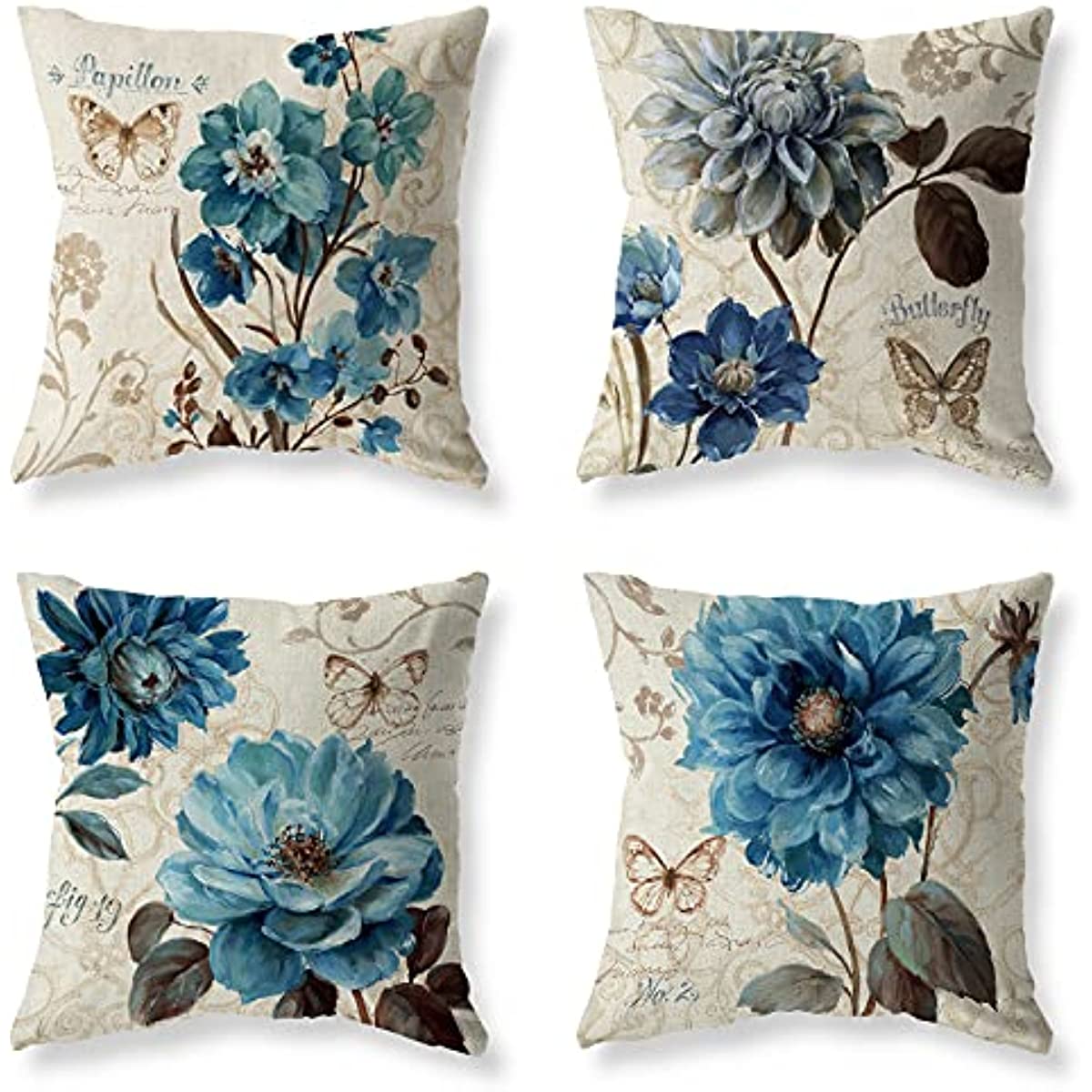 Set of 4 Farmhouse Blue Flower Throw Pillow Covers 18x18 Inch Orchid Butterfly Cotton Linen Floral Cushion Case Outdoor Sofa Throw Pillows Cover for Couch Living Room Bed Indoors Home Decor