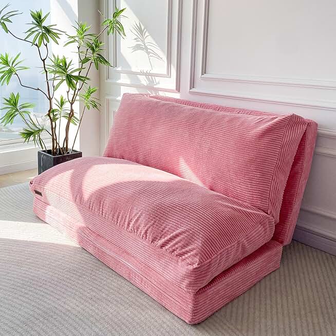 MAXYOYO Bean Bag Bed Folding Sofa Bed Floor Mattress for Adults, Extra Thick and Long Floor Sofa with Corded Washable Cover, Pink, 54x95 Inch