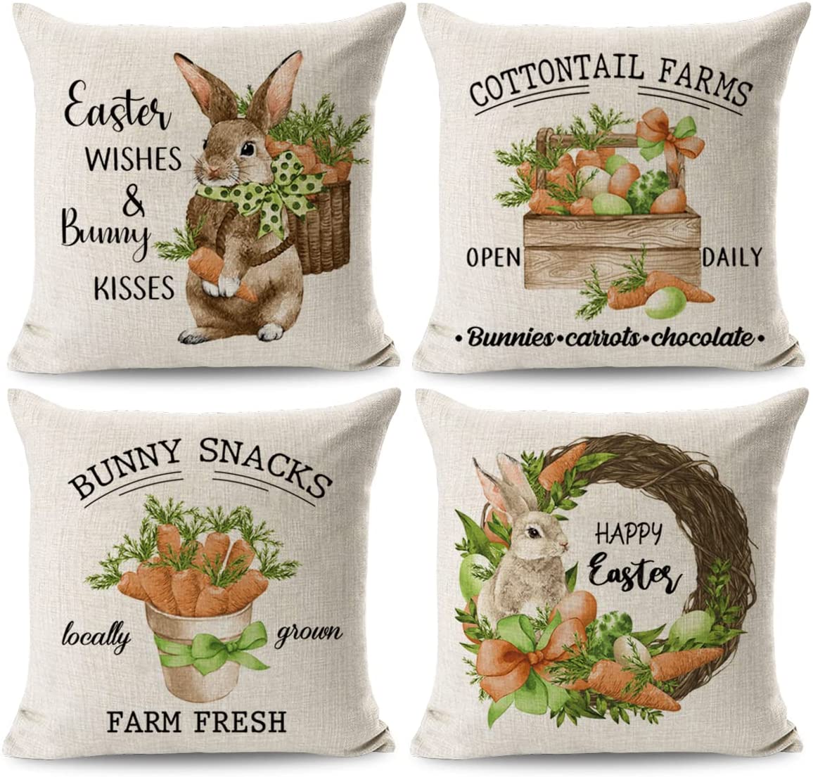 Bunny Easter Throw Pillow Covers 18x18 Set of 4, Carrot Easter Decorations Farmhouse Spring Pillow Covers Home Decor for Couch Sofa Porch