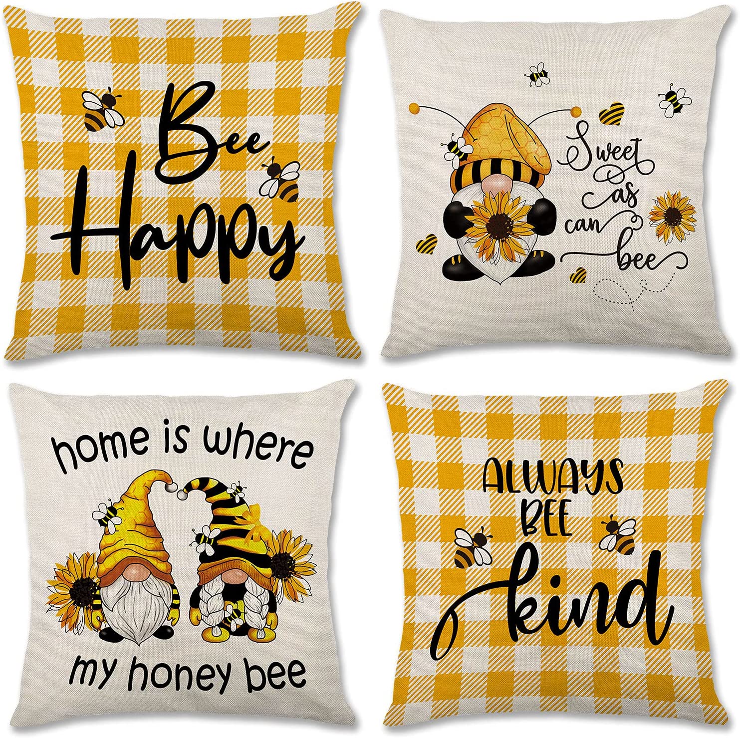 Summer Outdoor Pillow Covers Set of 4,Linen Throw Pillow Cover Yellow Bee Honey, Decorative Cushion Case for Sofa Bed Holiday Home Decor, 18x18inch