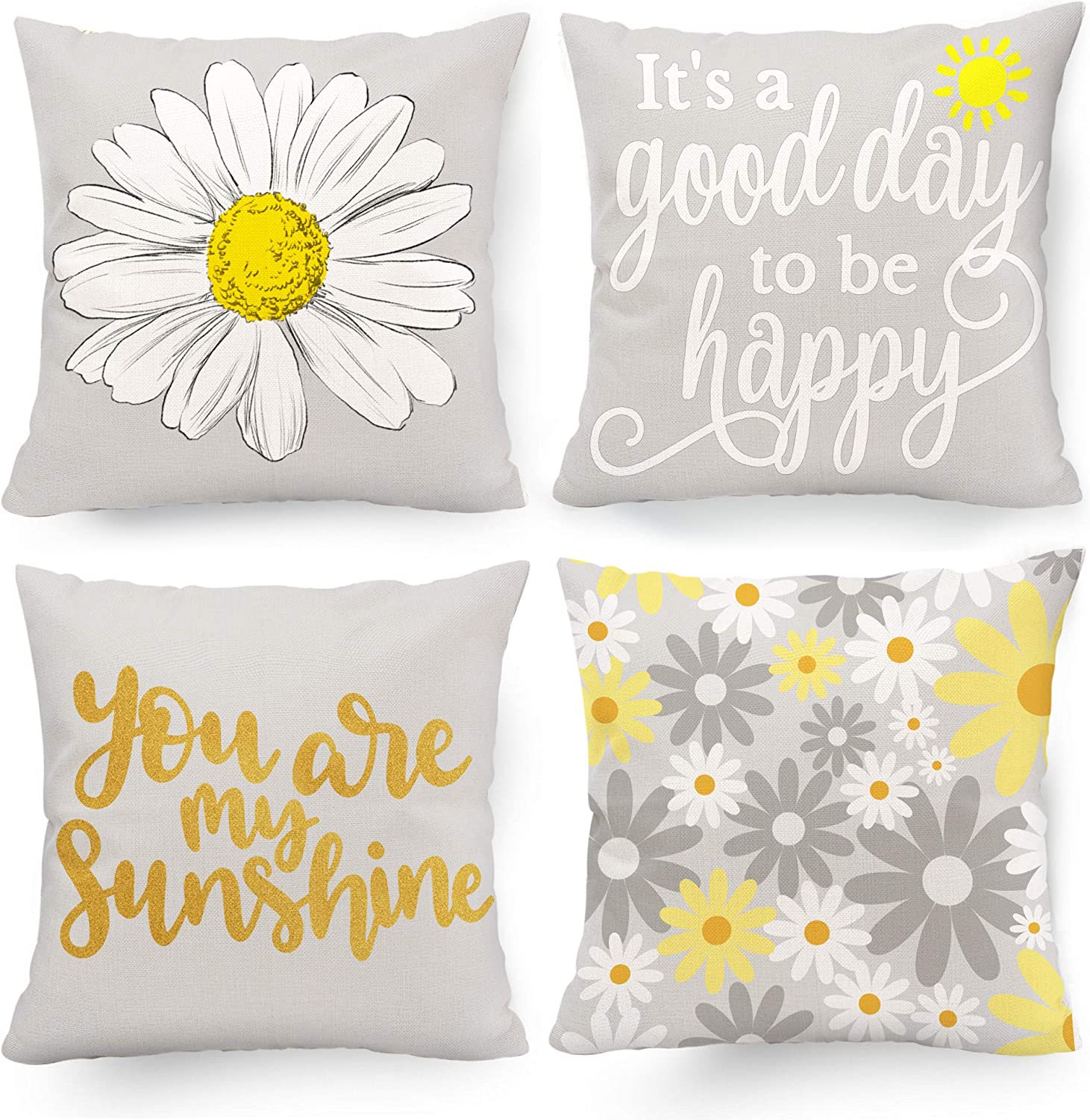 Spring Summer Pillow Covers 18x18 Set of 4, Yellow Grey Decor Pillows Sunflower Throw Pillow Covers 18x18 Indoor Outdoor for Couch Sofa Cushion Bed Outdoor Spring Summer Decorations for Home