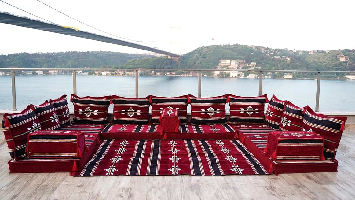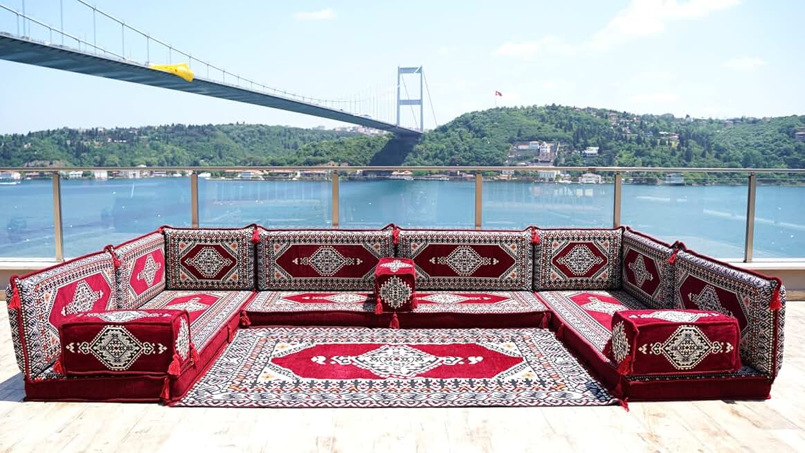 U Shaped Arabic Sofa Set, Floor Cushions, Patio Sofas, Floor Sofa, Pallet Sofa, Ethnic Sofa, Moroccan Rug, Sectional Sofas, Arabic Majlis Set (4'' Thickness Sofa, U Sofa + Rug, Burgundy)