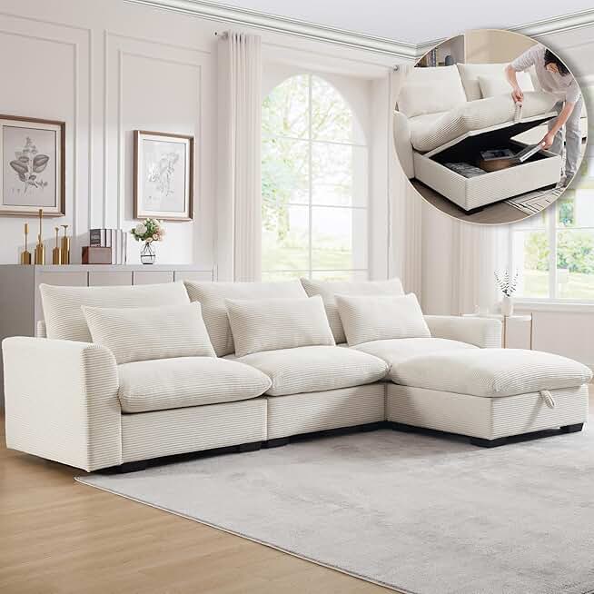 Convertible Modular Sectional Sofa Couch, L-Shaped 3 Seat Sleeper Couch with Corduroy Upholstered and Movable Ottoman,122" Deep Seat Comfy Cloud Couch for Living Room (Beige, 3-Seat + 1 Ottoman)