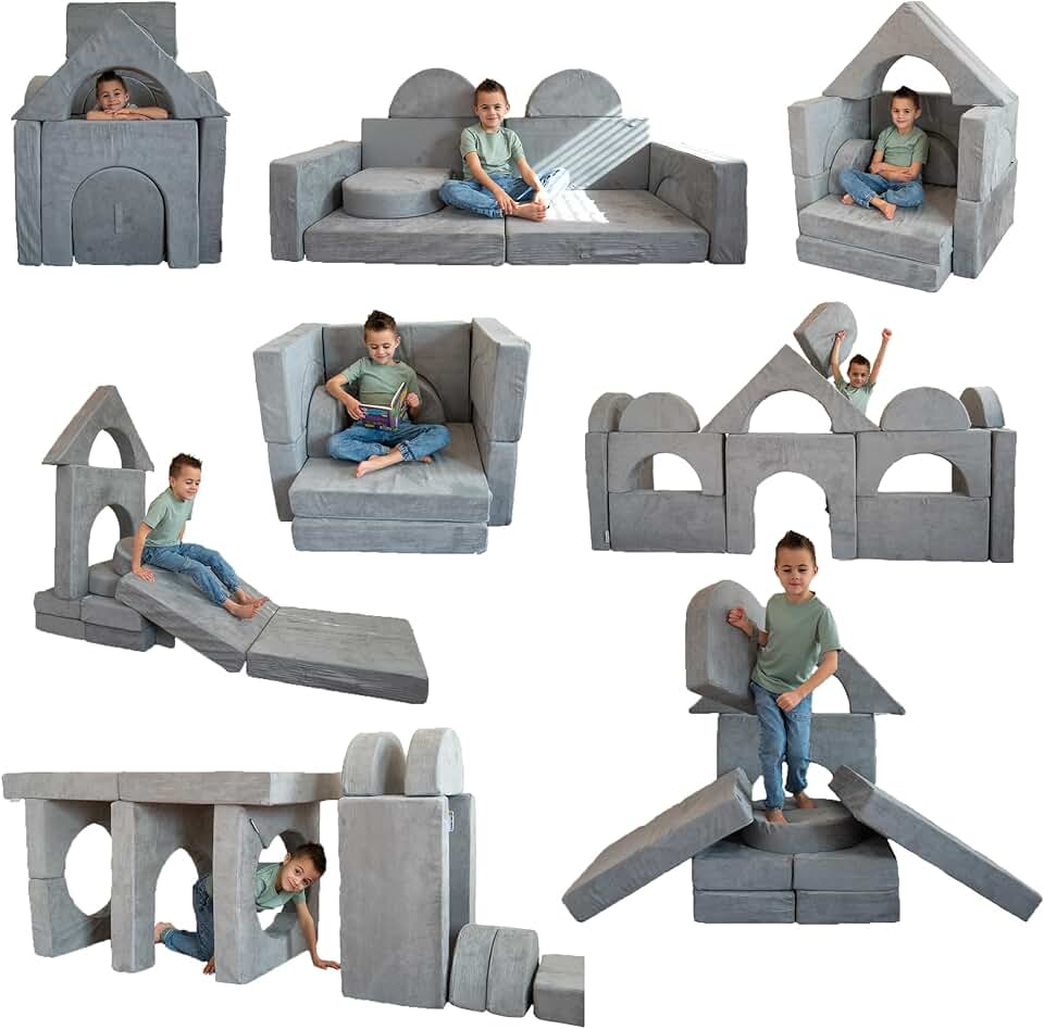 Kids Couch Sofa Toddler Modular Building Fort and Play Set Foam 14-Pieces (Grey)