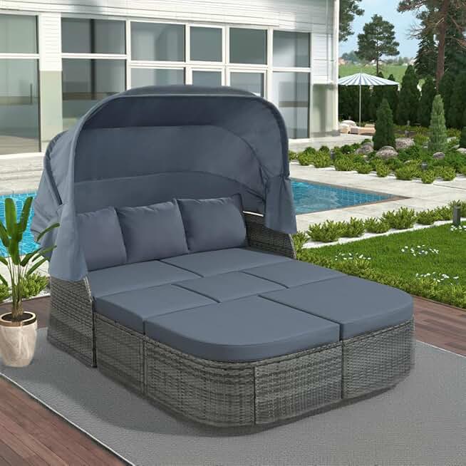 NicBex Outdoor Patio Retractable Daybed with Canopy,Outdoor Wicker Rattan Furniture Sets with Lift Coffee Table,Outdoor Sectional Cushioned Sofa Bed Conversation Set for Yard,Pool or Backyard,Gray