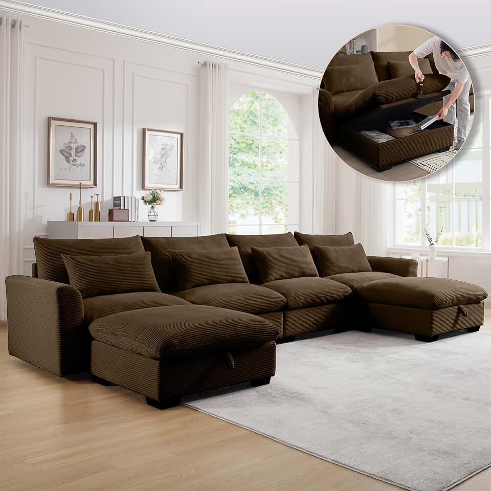 Modular Sectional Sofa with Storage, Convertible Sectional Couches for Living Room, U Shaped Sectional Sofa with Chaise, 157" Deep Seat Comfy Cloud Couch (Brown, 4-Seat + 2 Ottoman)