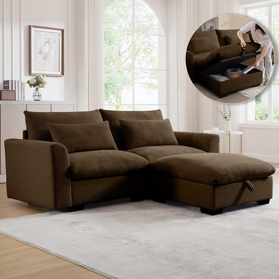 Oversized Convertible Modular Sectional Sofa Corduroy Upholstered Sleeper Couch with Movable Ottoman & Storage Chaise, 87" L Shape Couches for Living Room (Brown, 2-Seat + 1 Ottoman)