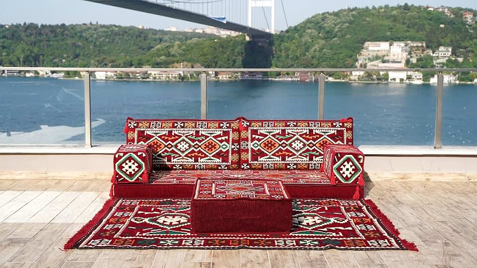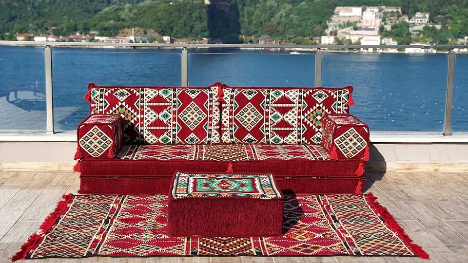 Modern Arabic Majlis Set, Floor Sofa Set, Ethnic Sofa, Arabic Jalsa, Moroccan Sofa, Sectional Sofa with Ottoman, Floor Cushion, Sofa Covers (Sofa + Rug + Ottoman, 4'' Thickness (10 cm))