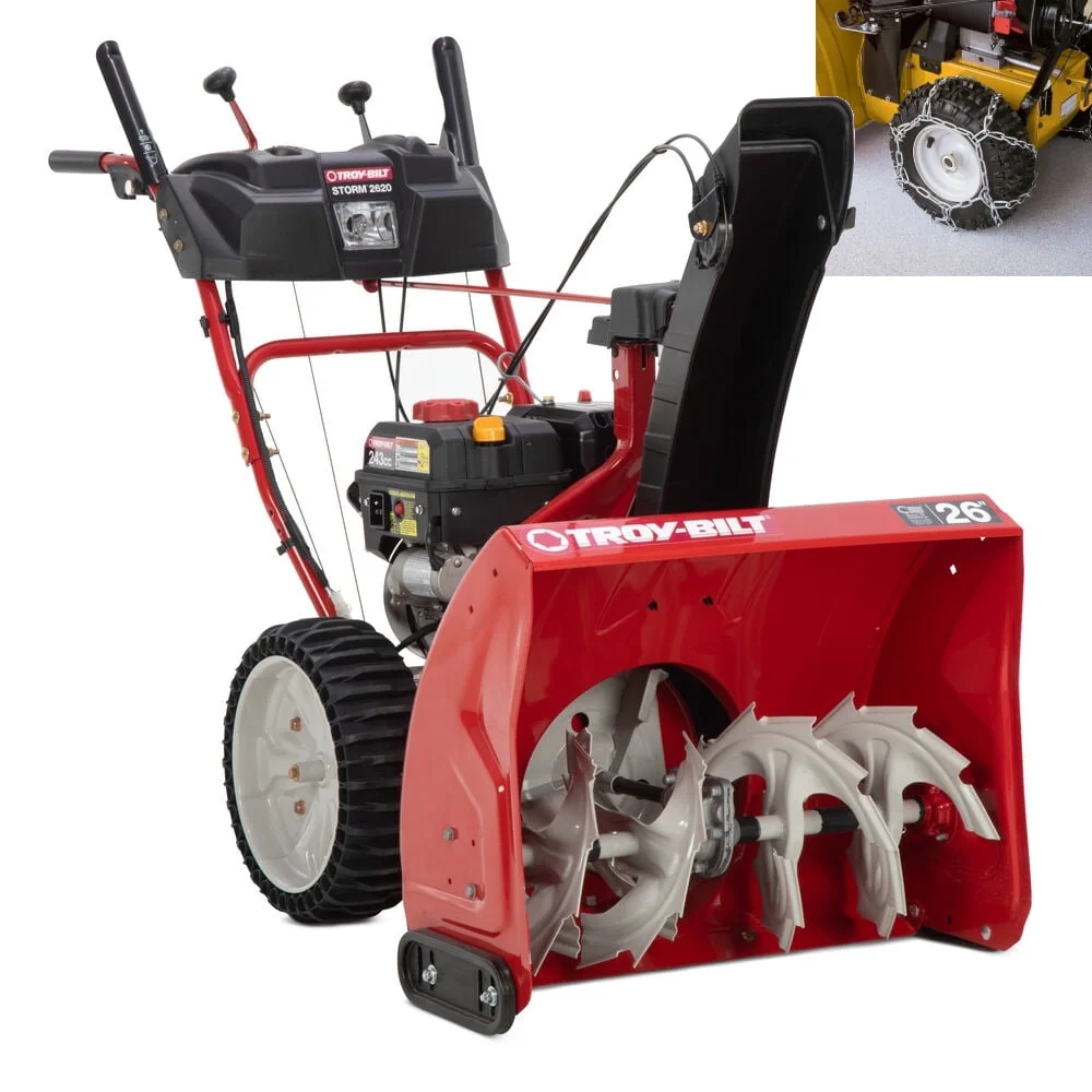 Restored Troy-Bilt Storm 2620 | 2-Stage Self Propelled Gas Snow Blower| 26 in. | 243 cc | Electric Start, Airless Tires & Snow Tire Chains (Refurbished)