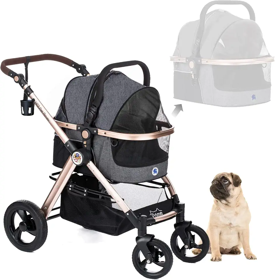 HPZ Pet Rover Prime 3-in-1 Luxury Dog/Cat/Pet Stroller (Travel Carrier+Car Seat+Stroller) with Detach Carrier/Pump-Free Rubber Tires/Aluminum Frame/Reversible Handle for Medium&Small Pets(Stone Gray)