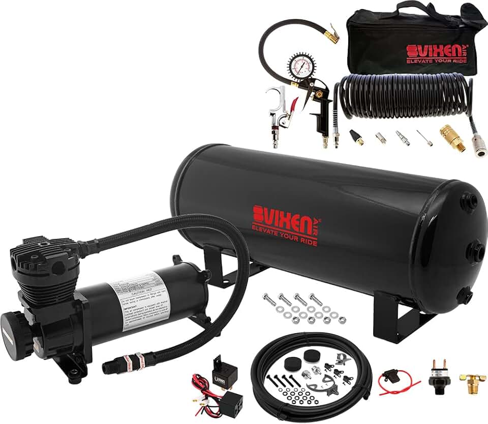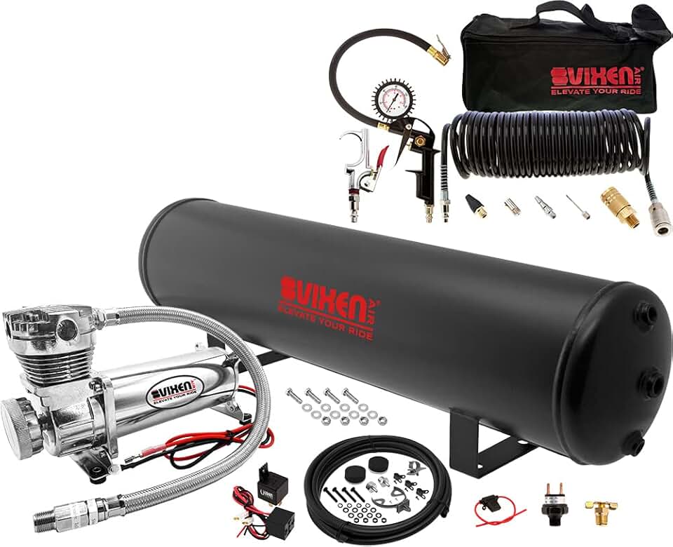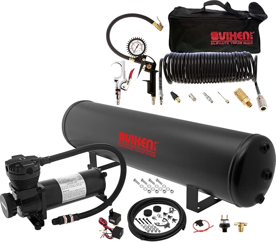 Vixen Air Suspension Kit for Truck/Car Bag/Air Ride/Spring. On Board System- 200psi Compressor, 4 Gallon Tank (VXO4840B), Tire Inflation Kit with Blow Gun (VXK1490)