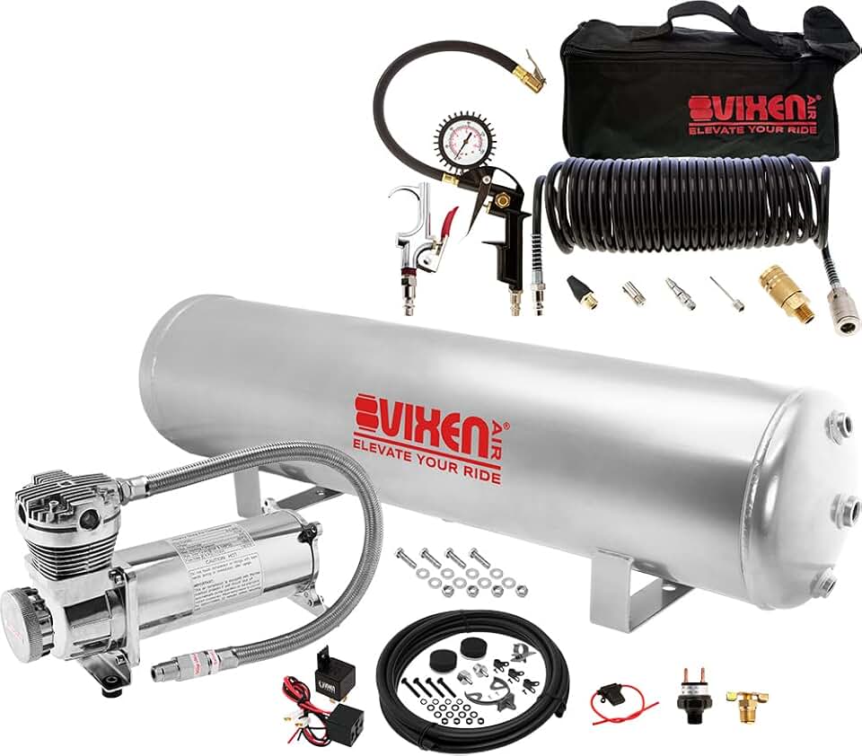 Vixen Air Suspension Kit for Truck/Car Bag/Air Ride/Spring. On Board System- 200psi Compressor, 5 Gallon Tank (VXO4852C), Tire Inflation Kit with Blow Gun (VXK1490)