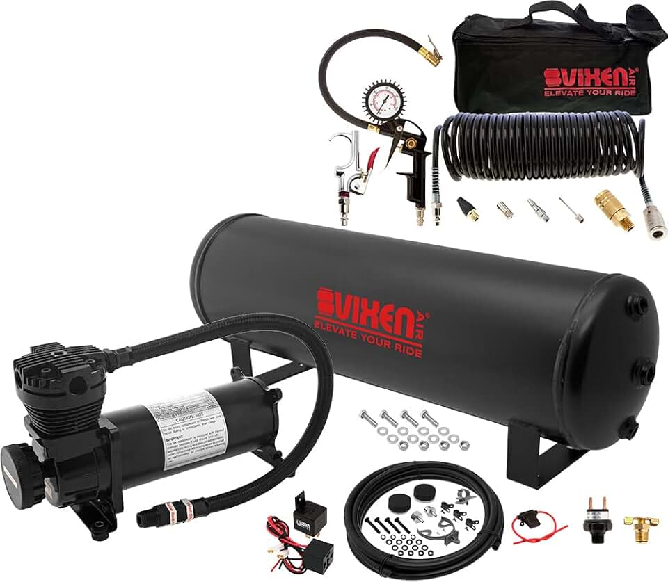 Vixen Air Suspension Kit for Truck/Car Bag/Air Ride/Spring. On Board System- 200psi Compressor, 4 Gallon Tank (VXO4841B), Tire Inflation Kit with Blow Gun (VXK1490)