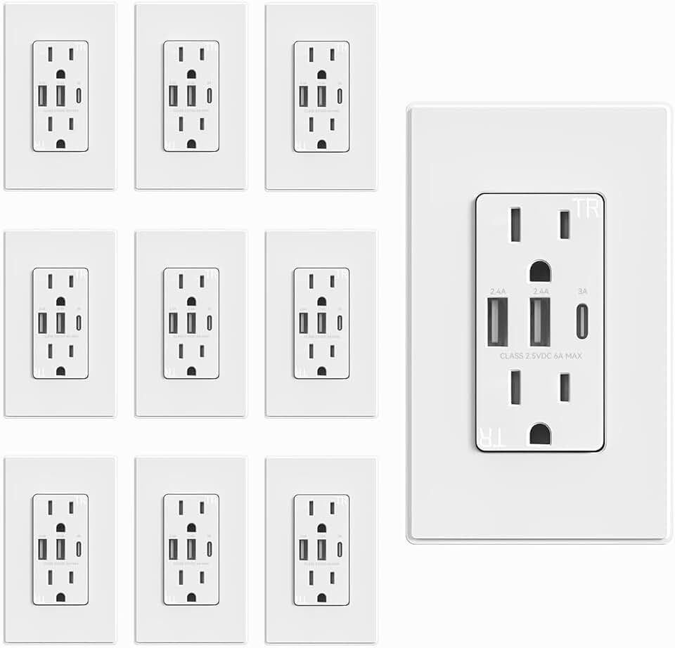 ELEGRP USB Outlets Receptacles, 3-Port USB C Wall Outlet, 30W 6.0A USB Electrical Outlet, 15 Amp Tamper-Resistant Outlet with USB C Ports, UL Listed, Screwless Wallplate Included, 10 Pack, Matte White