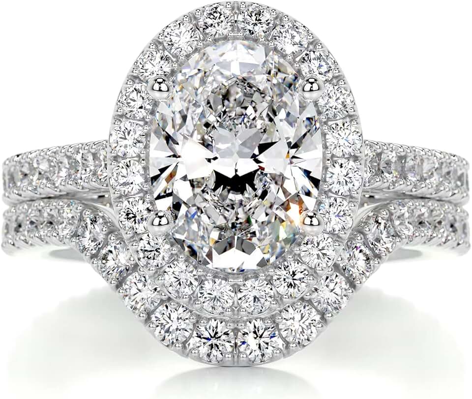 3 CT Oval Cut Halo Bridal Ring Set Handmade Engagement Ring for Women Anniversary Promise Gifts for Her Moissanite (White)