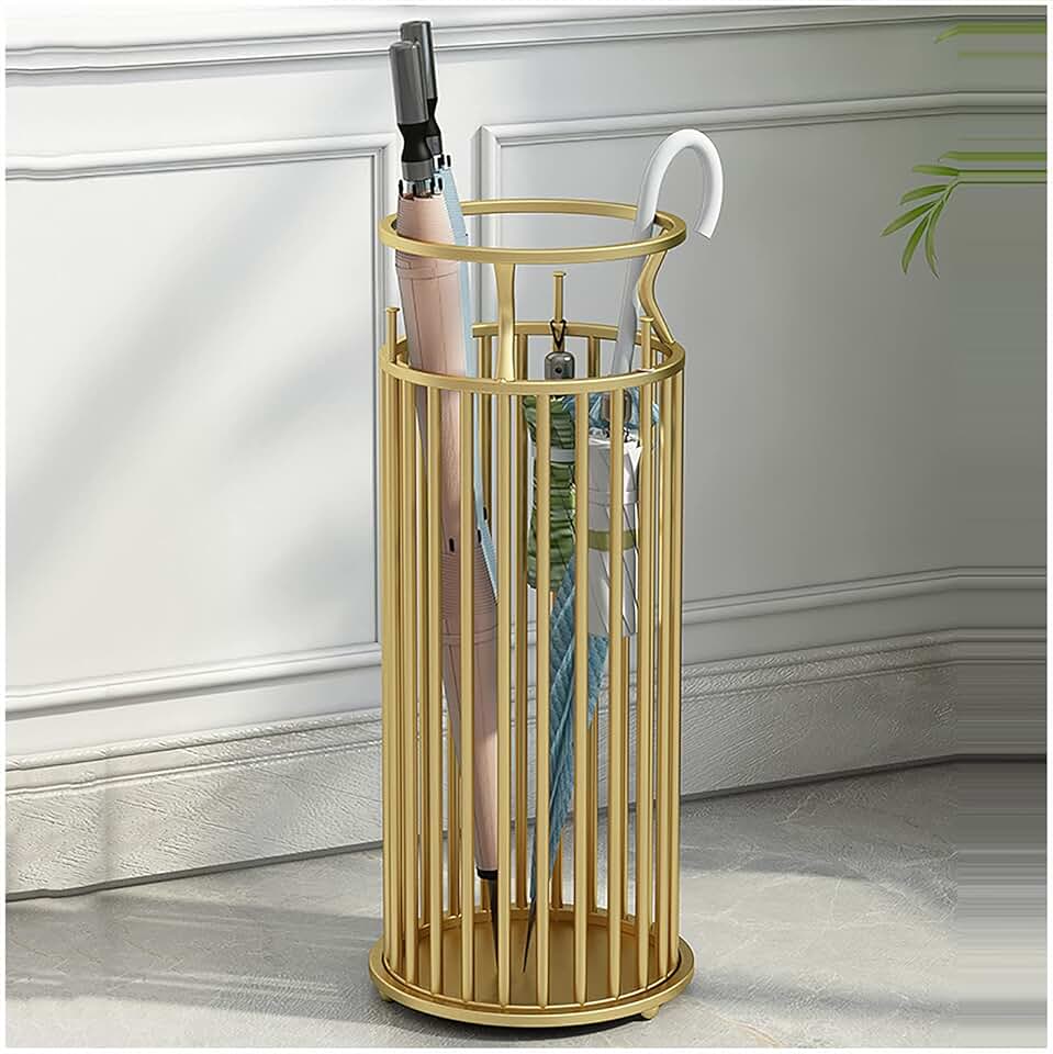 Umbrella Stands Round Metal Umbrella Stand, with Hook and Drip Tray Rain Cutout Design Umbrella Holder, Can Storage Long Short Umbrella,for Hallway(Color:Gold)