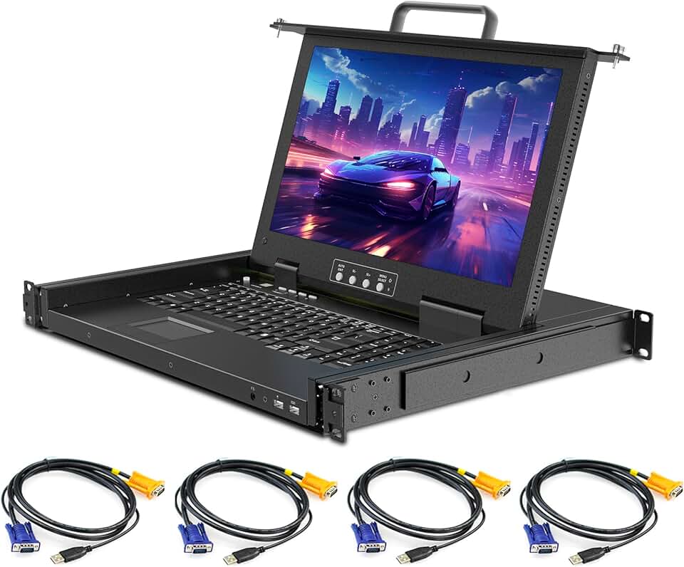 4 Port Rack Mount KVM Console VGA w/15.6'' FHD Monitor, 1080P LCD KVM Console,Short Depth 14.17", 1U KVM Switch Drawer+Keyboard+Touchpad+8 KVM Cables, OSD Menu Switch,Front USB Ports,Dual Power Supply