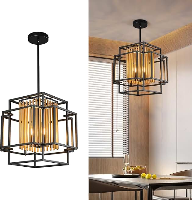 Farmhouse Rustic Square Chandelier Black Metal Decorative Round Tube Pendant Light Antique Ceiling Lamp for Dining Room, Living Room, Bedroom, Kitchen Island and Foyer