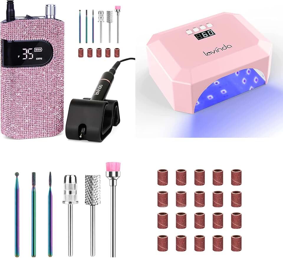 Lavinda Cordless Nail Lamp, UV LED Nail Lamp 56W Nail Dryer for Gel Polish & Professional Nail Drill Machine 35000RPM Electric Nail File for Acrylic Gel Nails Pink Diamond