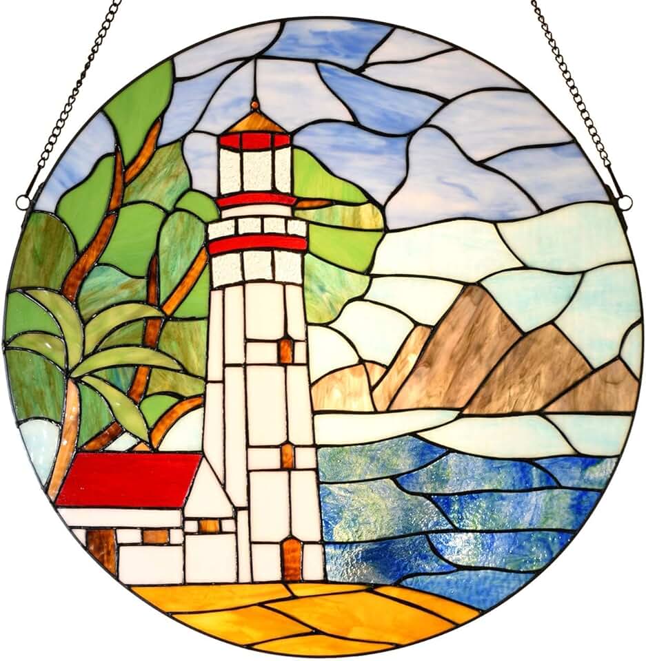 Bieye W10088 Lighthouse Tiffany Style Stained Glass Window Panel, 22-inch Wide Round Shape