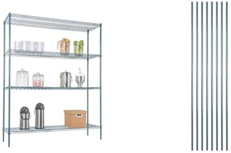 Restaurantware Bundle: RW Base 18 x 60 Inch Green Epoxy Shelves and 74 Inch Posts, 4 Wire Shelves and Posts - NSF-Certified, 32 Split Sleeves, 4 Leveling Feet, for Restaurants, Kitchens, and Garages