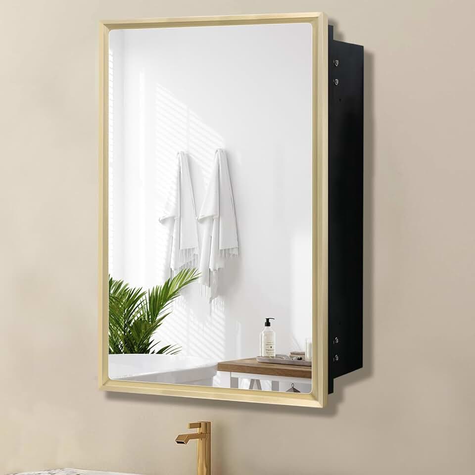 Bathroom Medicine Cabinet with Mirror, Recess or Surface Mount Bathroom Vanity Mirror Cabinet,Single Door Cabinet Famerhouse Bathroom Mirror with Storage Cabinet (Brush Gold, 16"x26")
